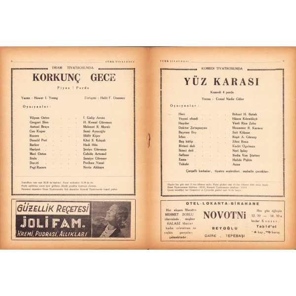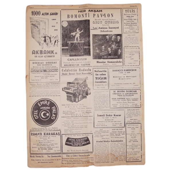 Arkası bol reklamlı: " Bomonti Pavyon", "Akbank", " Celalettin Rodoslu", " Ankara Otel Emre Palas"