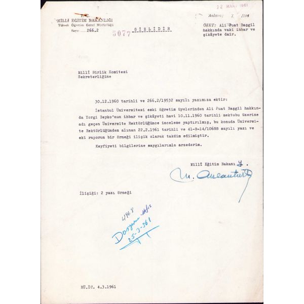 Ali Fuat Başgil hakkındaki ihbar ve şikayete dair.