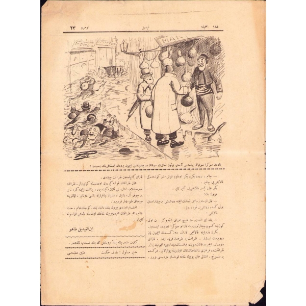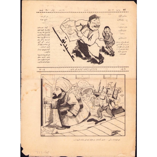 "Şura-yı Devlet Reîsi: Haydi arkadaşlar sırtlayın masaları başka daireye!..." *3 Kasım 1910 tarihinde çıkarılmaya başlanan ve 10 Ekim 1912 tarihine kadar yayın hayatını sürdüren Türkçe mizah gazetesi Gıdık'ta güncel haberlerin mizahî bir üslupla değerlendirildiği yazıların yanında hikâye, şiir, roman gibi edebi türlere de yer verilmiştir.