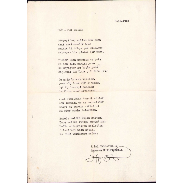 "Bütçeyi hep soktun sen fona, Akıl erdiremedik buna, Baktık ki bütçe çok küçülmüş, Kalmışız bir gömlek bir dona"