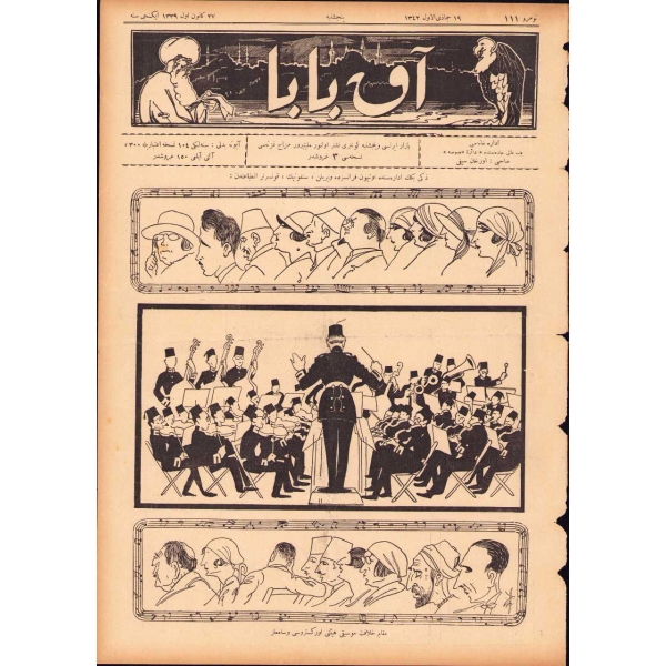"Makam-ı Hilafet Musikî Heyeti Orkestrası ve sâmi'ler" *Türkiye'nin en uzun ömürlü mizah dergilerinden olan Akbaba, 1922 yılında Yusuf Ziya Ortaç ve Orhan Seyfi Orhon tarafından kurulmuş ve kesintilerle birlikte 1977'ye kadar yayın hayatını sürdürmüştür. Zaman içerisinde de toplumun yoksul kesiminin dergisi olarak geniş bir okuyucu kitlesine ulaşmıştır.