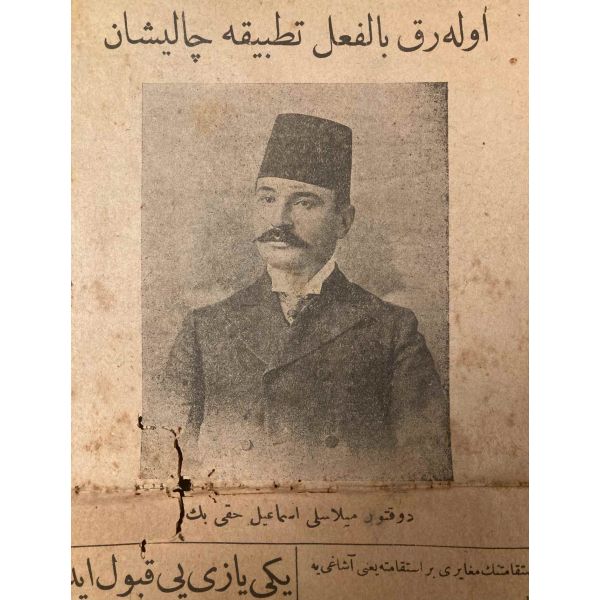 "Memleketimizde ayrı harfleri [bitişik olmayan Osmanlıca harflerle yazı biçimi] ilk defa olarak uygulamaya çalışan Doktor Milaslı İsmail Hakkı Bey" kapak görseliyle