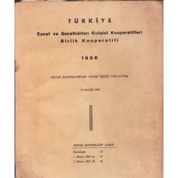 İçerik: İzmir Esnaf Kefalet Kooperatifi 1955 Umumi Heyet Toplantısı, El Tezgâhı Pamuklu Dokuma Yeni Standardları, Birlik Kooperatifi Esas Mukavelenamesi, Sivas Esnaf Kefalet Kooperatifi Altıncı Hesap Yılı vd.