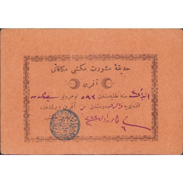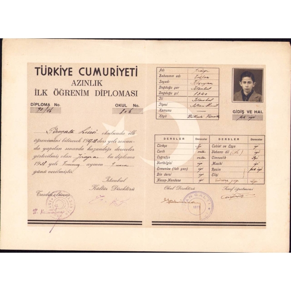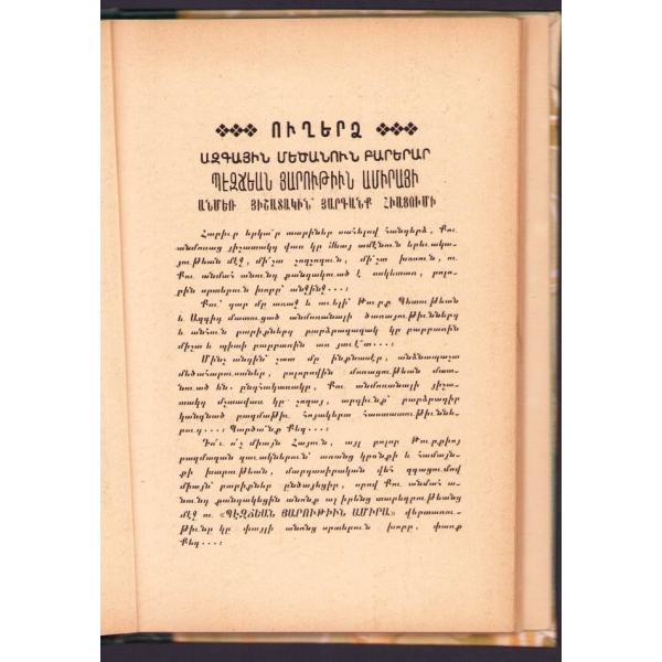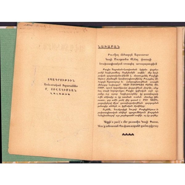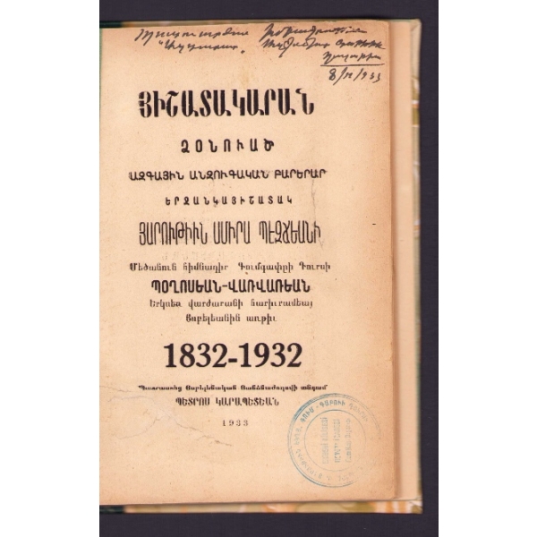 Harutyun Amira Bezciyan tarafından kurulan Boğosyan-Varvaryan Okulunun 100 yılı anması için basılmıştır. Üst kısmında ıslak olarak Galata'da 8.12.1933 tarihinde Aztarar Matbaasına hediye edldiği kaydedilmiştir.