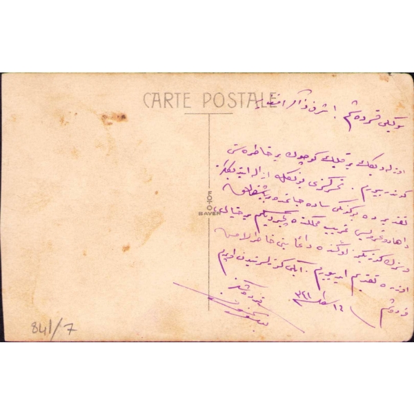 Ön yüzünde Osmanlıca, "Her gün girdiğim kapı. Şimdi sarayın dördüncü katında ikamet ediyorum. Fakat şimdi böyle atlı arabalar yerine otomobil kaim oluyor…" yazmaktadır.