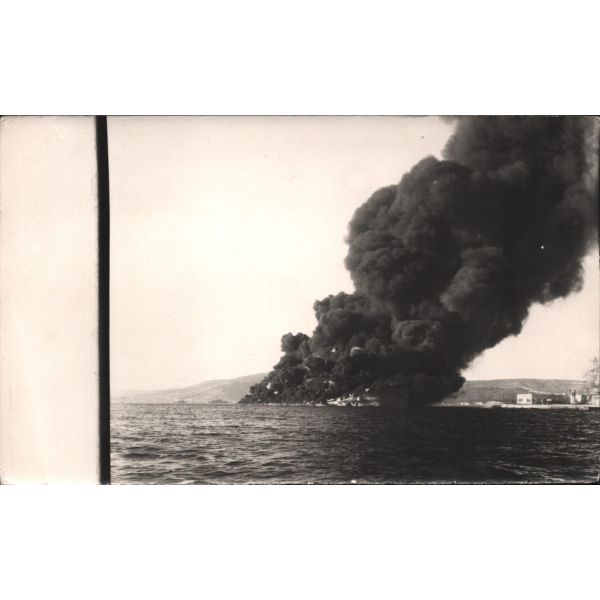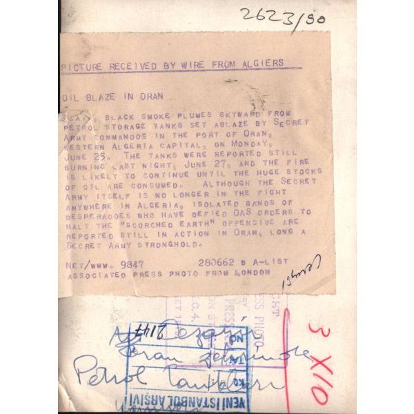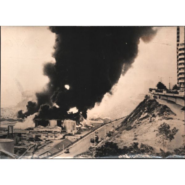 "Cezayir´in batısındaki Oran limanında gizli ordu komandoları tarafından ateşe verilen petrol depolama tanklarından gökyüzüne doğru yoğun siyah dumanları yükseliyor."