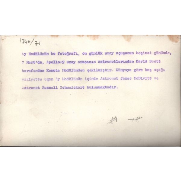 "Ay modülünün bu fotoğrafı, on günlük uzay uçuşunun beşinci gününde, 7 Mart´ta Apollo-9 uzay aracının astronotlarından David Scott tarafından komuta modülünden çekilmiştir."