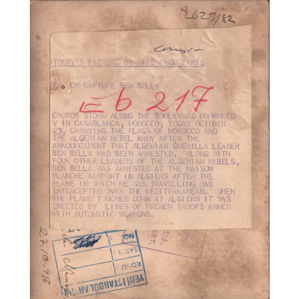 "Cezayir´in ilk devlet başkanı olan sosyalist asker ve devrimci Ahmed Ben Balla´nın tutuklandığının açıklanmasının ardından bugün 23 Ekim´de Fas´ın Kazablanka kentinde Muhammed V bulvarı boyunca kalabalıklar, Fas ve Cezayir isyancı ordusunun bayraklarını taşıyarak akın etti."