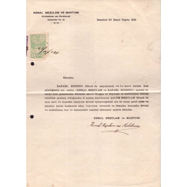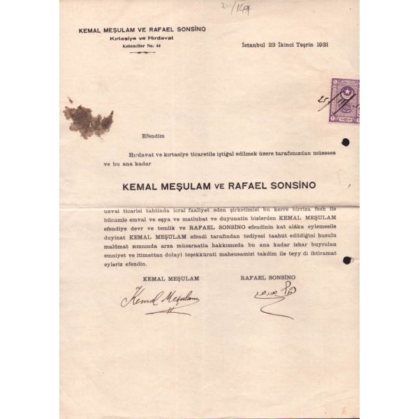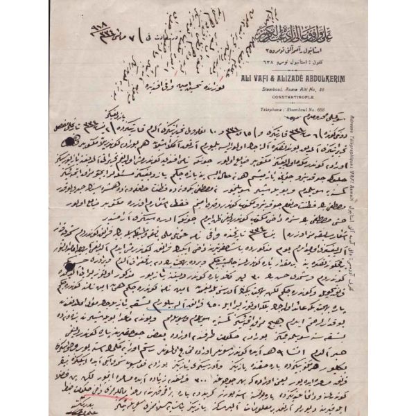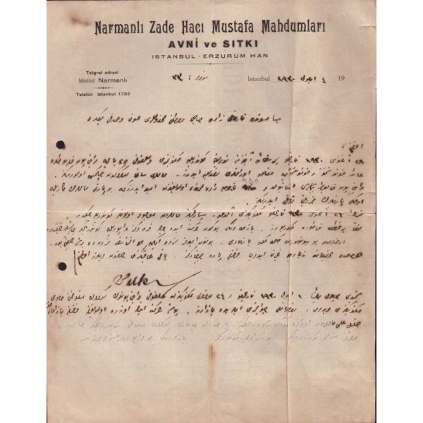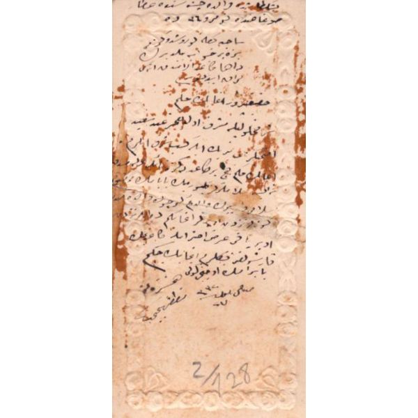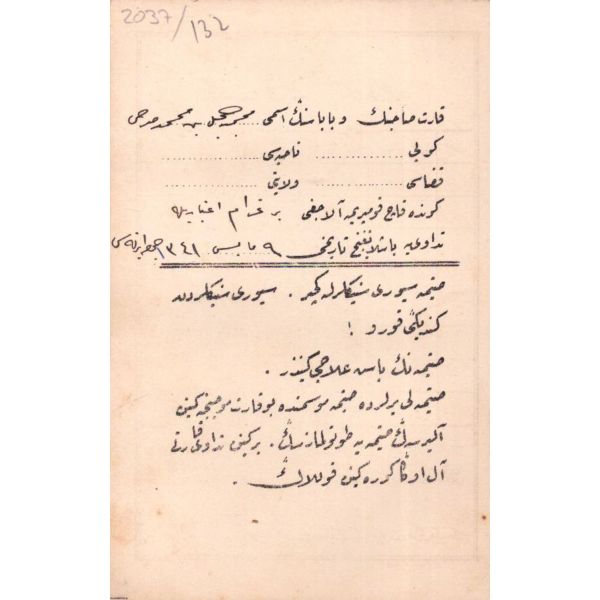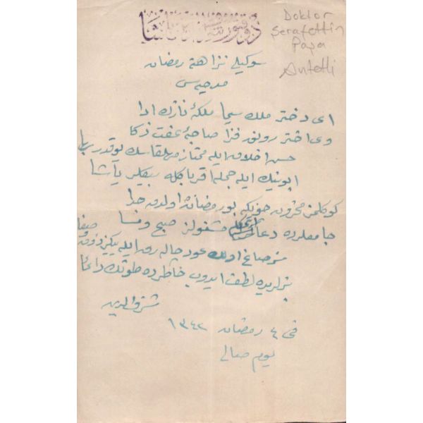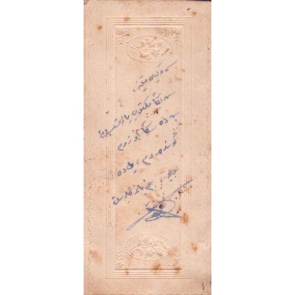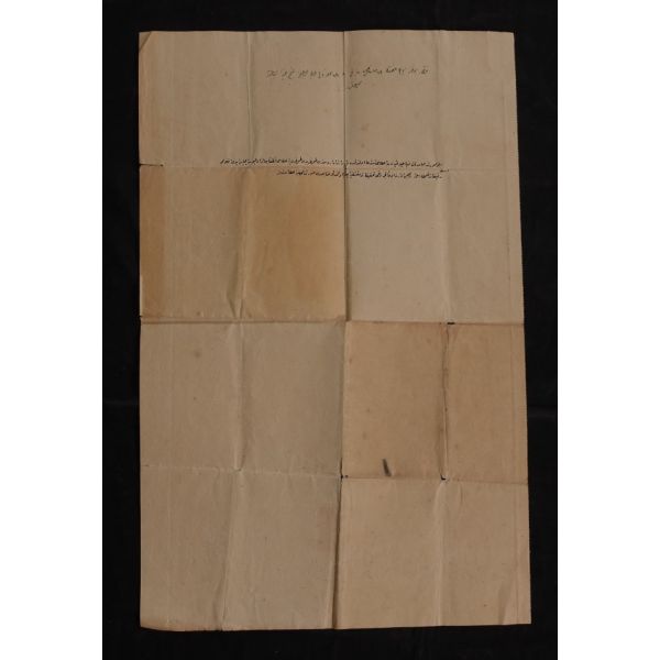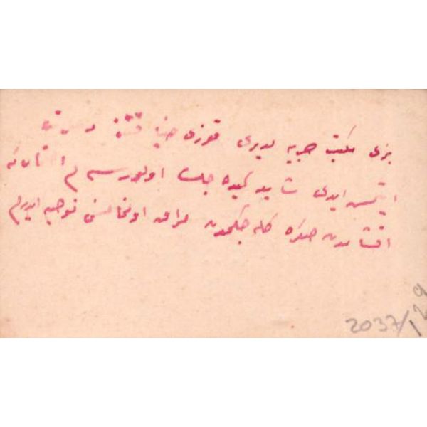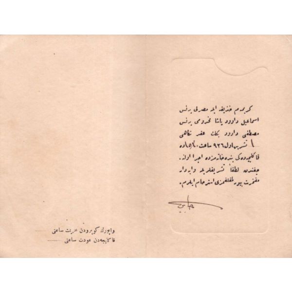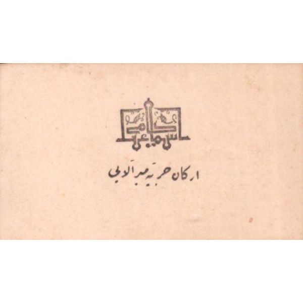 Arka yüzünde Osmanlıca notta "Bizi Mekteb-i Harbiye sediri Fevzi Ziya davet etmiş idi şayet gidecek olursam ihtimal ki akşamdan sonra geleceğimden merak olunmamasını tevci ederim" yazılıdır.