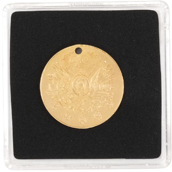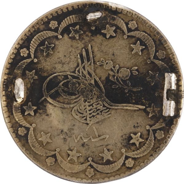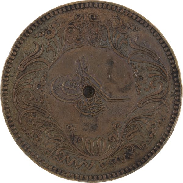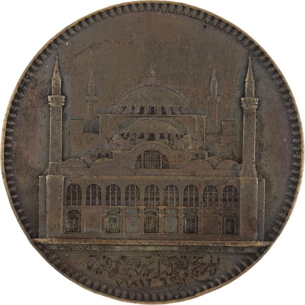 TUĞRA KISMINDA DELME İZİ VAR Ön yüzünde Abdülmecit Han´ın tuğrası ve arka yüzünde ise Ayasofya Camii şerifi ve altında Osmanlıca ´Tarih-i Tamir-i Ayasofya sene 1265 (1847)´ yazılı Abdülmecit Han´ın emri ile Mimar Gaspar Fosatti nezaretinde 2 yılda tamamlan ve büyük bir törenle ibadete yeniden açılan Ayasofya Camii anısına bastırılmış ve devletin ileri gelenlerine hatıra olarak verilmiş.