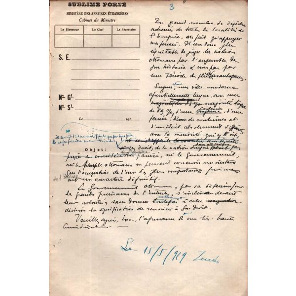 "… Geçen gün bilvesile duyduğuma göre Hükümet, sefirleri hep yeni zevatdan terkib etmek niyetinde imiş. Bu vaziyetin istisnası olub olmayacağını tahmin edemiyorum."