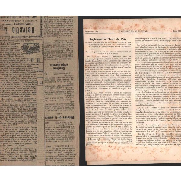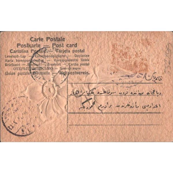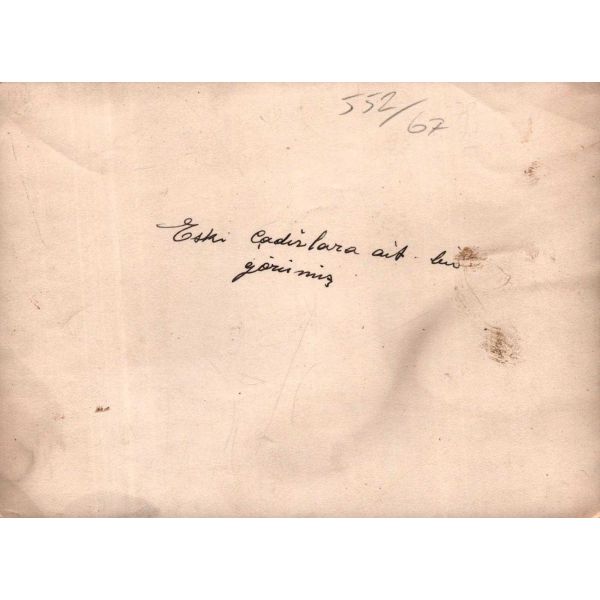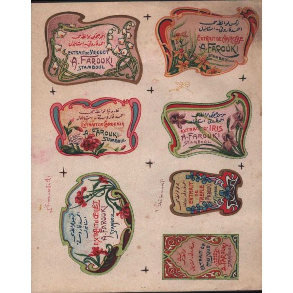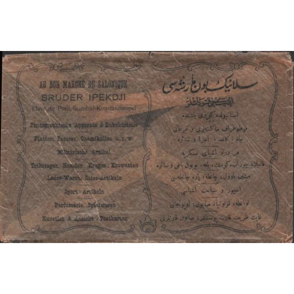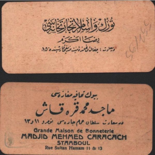 Kartlardan birinin arka yüzünde, Osmanlıca-Fransızca "Büyük Tuhafiye Mağazası Macid Mehmed Karakaş, Dersaadet", diğerinin arkasında ise Osmanlıca "Türk ve İslam Ticarethanesi Rıza Ekrem, Dersaadet" yazmaktadır.