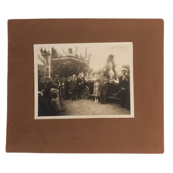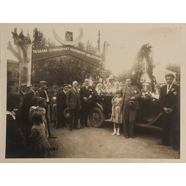 Beyefendilerin altı oklu yaka kartlarıyla poz verdiği fotoğrafta Atatürk portresinin asılı olduğu "Yaşasın Cumhuriyet Hakimiyet Milletindir" yazılı tak ve Pendik Arabacılar Esnafı levhası görülmektedir.