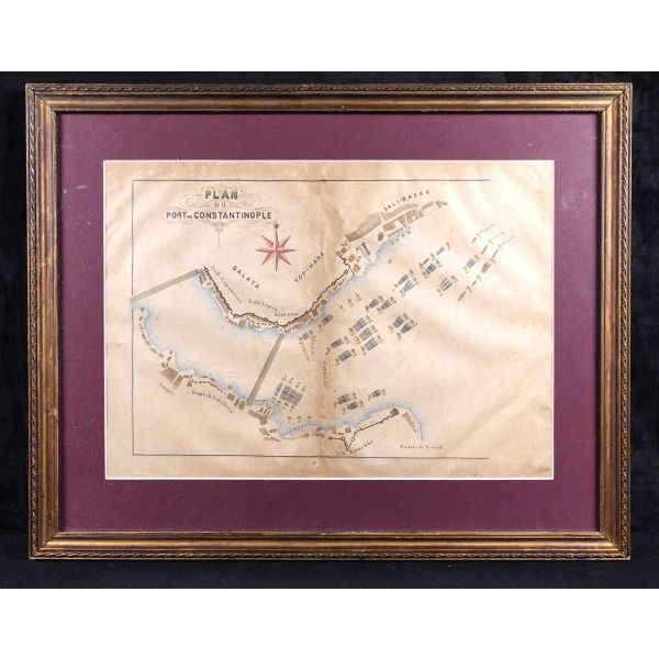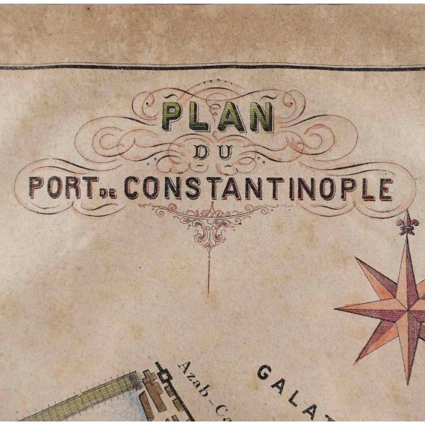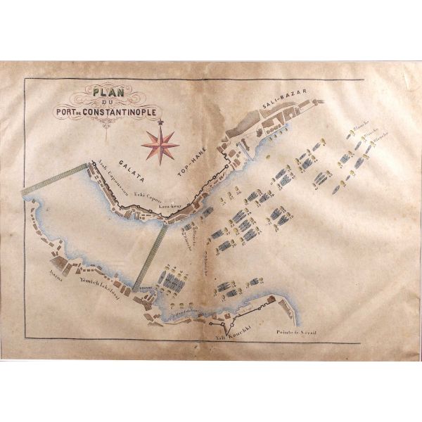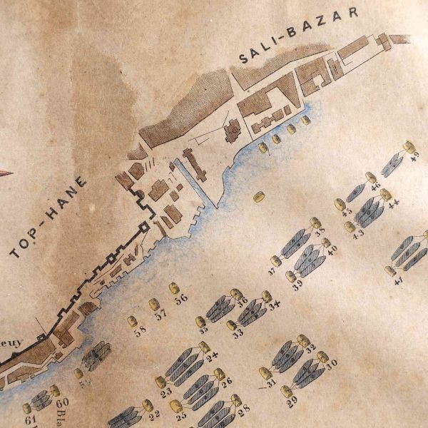Haliç´te, İstanbul [tarihî yarımada] ve Beyoğlu kıyılarındaki iskele ve limanları gösteren planda Yemiş İskelesi, Azapkapı, Eskikapı, Karaköy, Tophane, Salı Pazarı gibi mühim noktalar detaylarıyla gösterilmiştir.