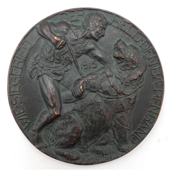 Prusya ordusunda uzun yıllar görev yaptıktan sonra 1911 yılında emekliliğe ayrılmış olan Prusyalı-Alman mareşal Paul von Hindenburg, 1914 yılında Birinci Dünya Savaşı´nın başlaması üzerine tekrar orduya çağrılmış ve Sekizinci Ordu´nun komutasına verilmiştir. Masurian Gölleri Savaşı ile Tannenberg Muharebesi´nde kazandığı zaferle ulusal kahraman haline gelen Hinderburg, Kasım 1914´te gerçekleşen Lodz Savaşı´ndan sonra mareşallik rütbesine terfi etmiş; 1916´da ise tüm Alman Kara Kuvvetlerinin komutanı olmuştur. Paul von Hinderburg´un halk nezdindeki itibarının hayli yüksek olduğu 1915 yılında üretilen madalyon, Hinderburg´u cesaret, yiğitlik ve şövalyeliği temsil eden mitolojik kahraman Siegfried ile özdeşleştirmektedir. Madalyonun arka yüzünde Rusya´yı temsil eden ayıyı bağlarken tasvir edilen Siegfried, 19. yüzyılda Alman milliyetçiliğinin yükselmesinde tarihsel bir öneme sahiptir.