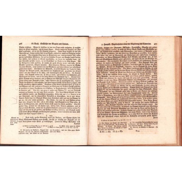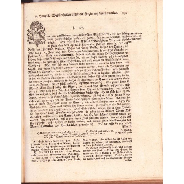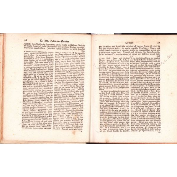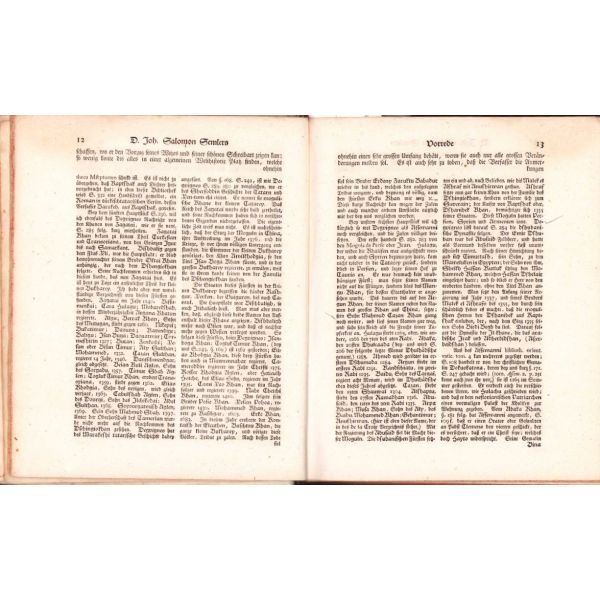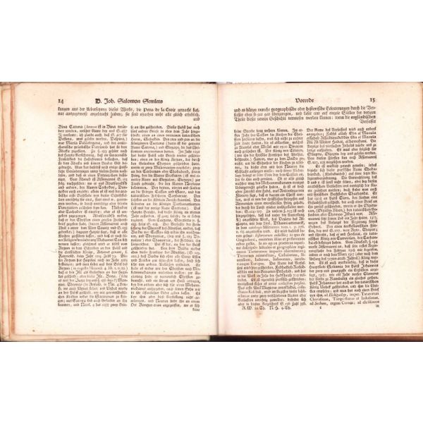 Alman rasyonalizminin [akılcılık] babası ya da mimarı sayılan Semler'in "Dünya tarihi" külliyatının ilk iki cildi. Semler, Protestan bir ilahiyatçı olarak 18. yüzyılda "Kutsal Kitap" ile Tanrı'nın kelâmının birbiri ile örtüşmediği düşüncesini öne sürerek döneminde radikal bir teoloji akımına öncülük etmiştir. İki cild içerisinde biri açılabilir olmak üzere yedi gravür mevcuttur. Bunun haricinde iki cilt içerisinde açılabilir üç adet harita mevuttur. Bunlar, Anadolu, Timur ve Orta Asya haritalarıdır.
