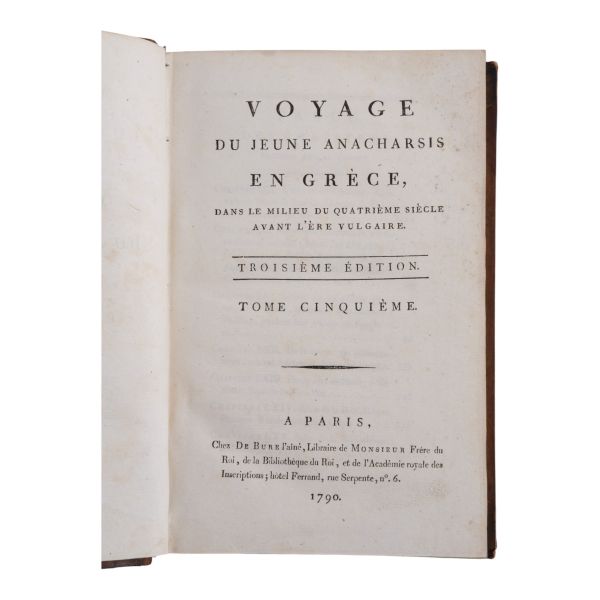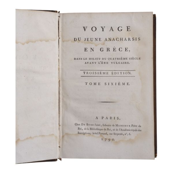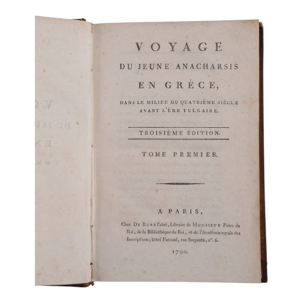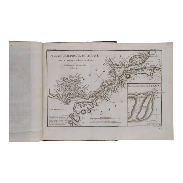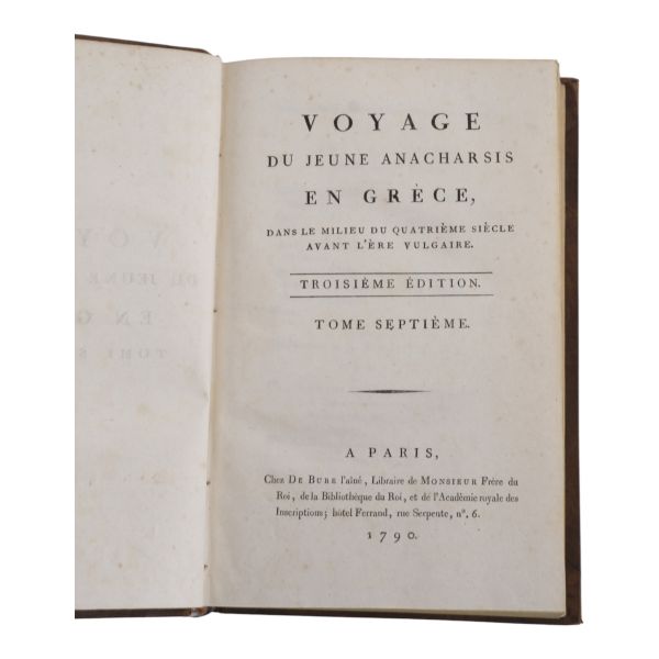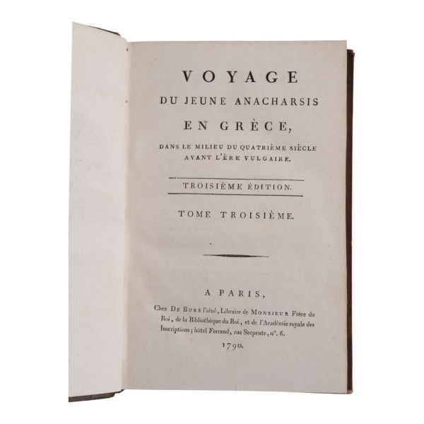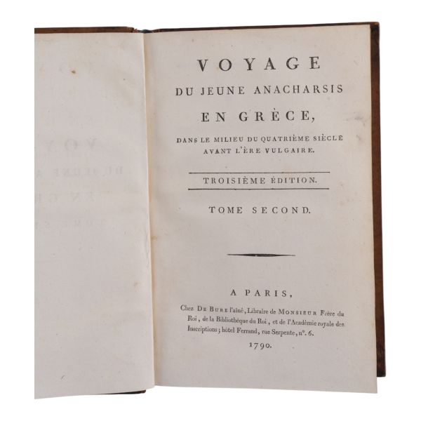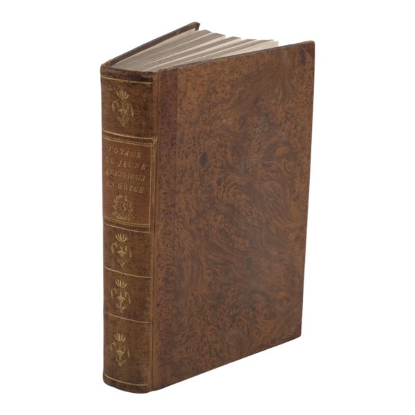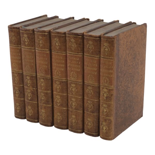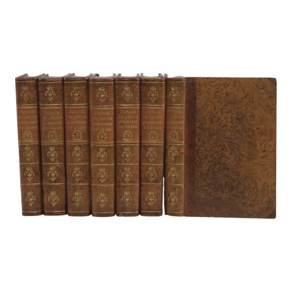Fransız tarihçi ve aydın Barthelemy´nin, MÖ 363 yılında Antik Yunan dünyasında gezinen Anacharsis ağzından Trakya, İstanbul, Bizans, Anadolu, İran, Mısır, Ege Adaları, Mora Yarımadası ve Atina´yı içeren seyahatnamesi... Sırtı altın yaldız dekor ve başlıklı, ebru kapaklı deri ciltlerinde. 1. cildin ön iç kapağında ex libris yer almaktadır.