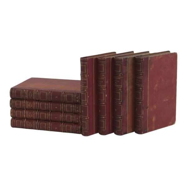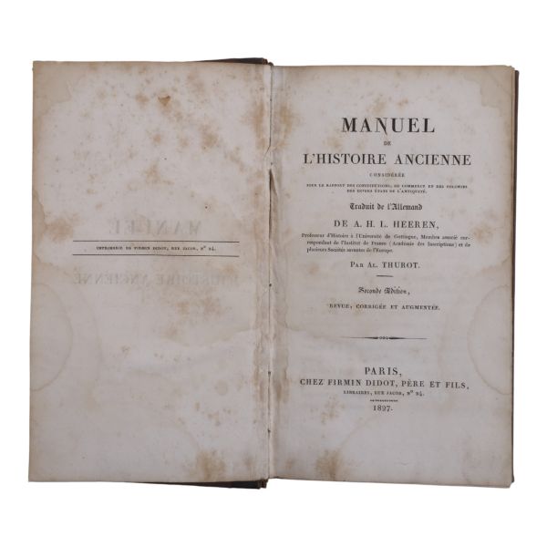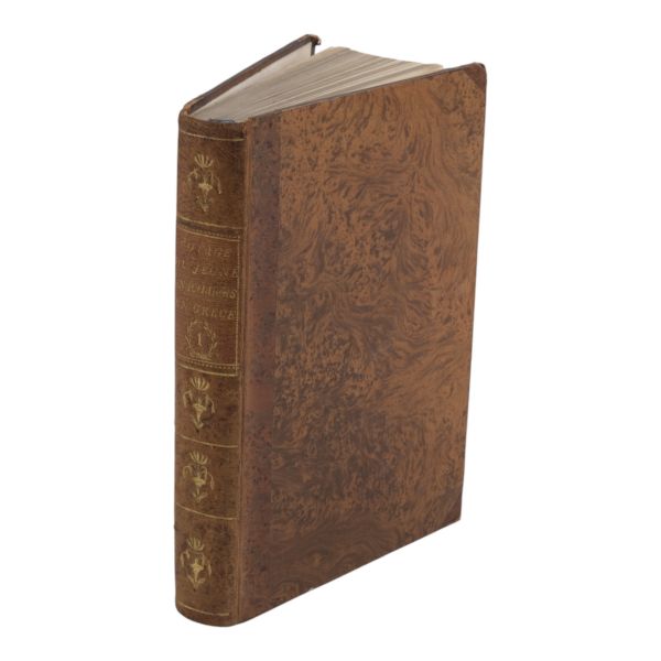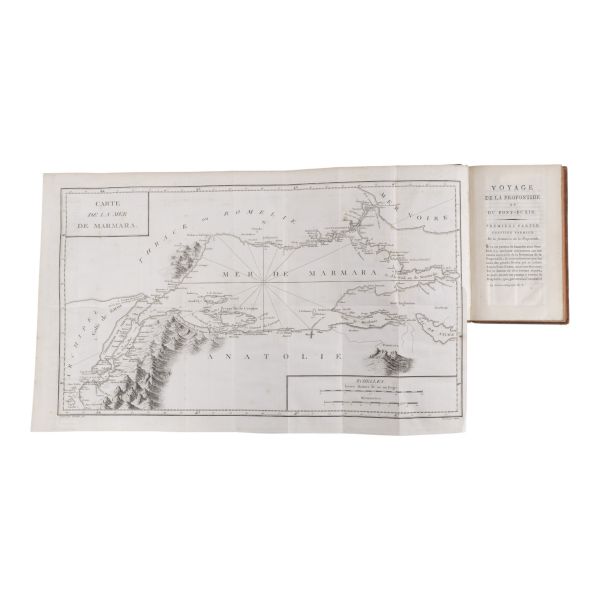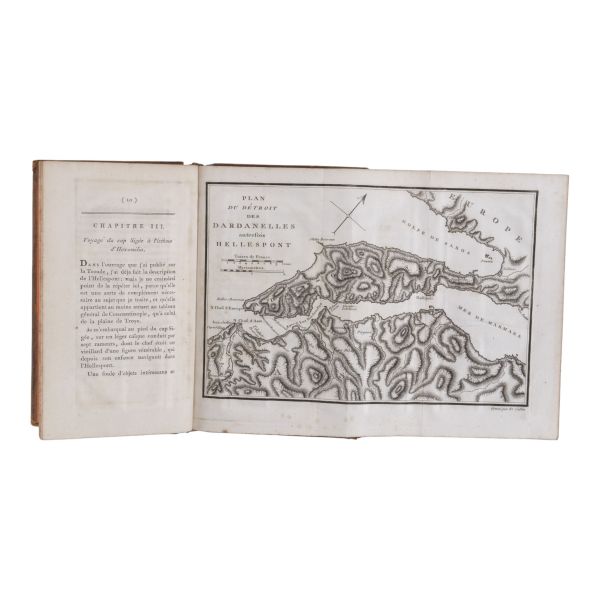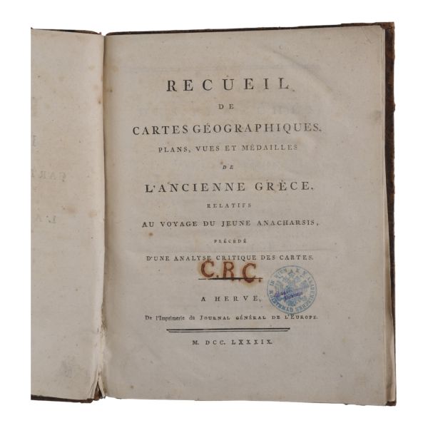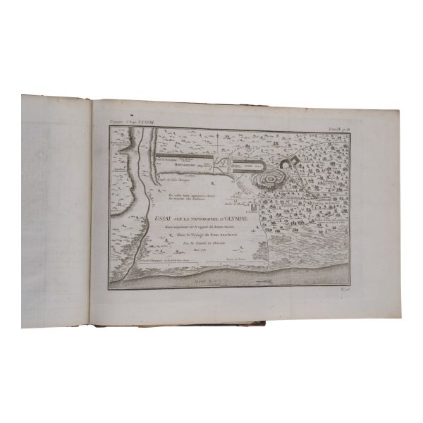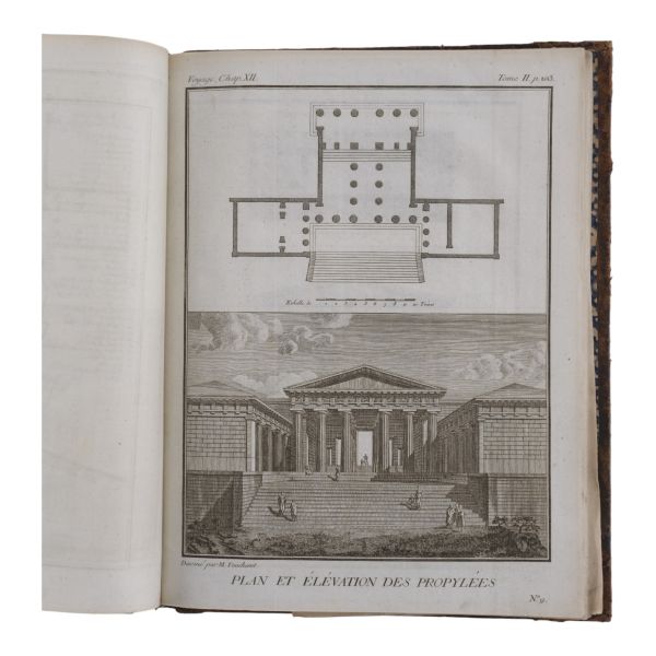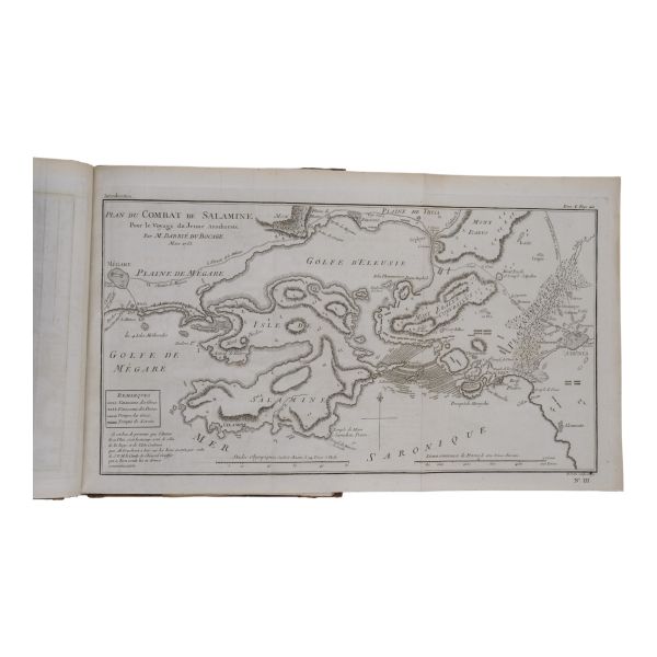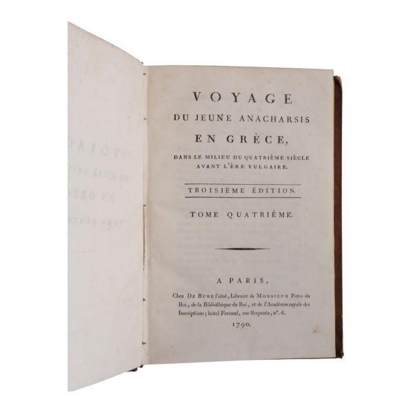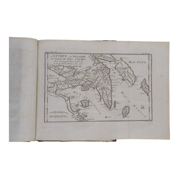 Fransız tarihçi ve aydın Barthelemy´nin, MÖ 363 yılında Antik Yunan dünyasında gezinen Anacharsis ağzından Trakya, İstanbul, Bizans, Anadolu, İran, Mısır, Ege Adaları, Mora Yarımadası ve Atina´yı içeren seyahatnamesi... Sırtı altın yaldız dekor ve başlıklı, ebru kapaklı deri ciltlerinde. 1. cildin ön iç kapağında ex libris yer almaktadır.