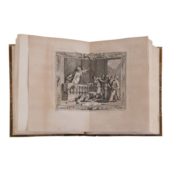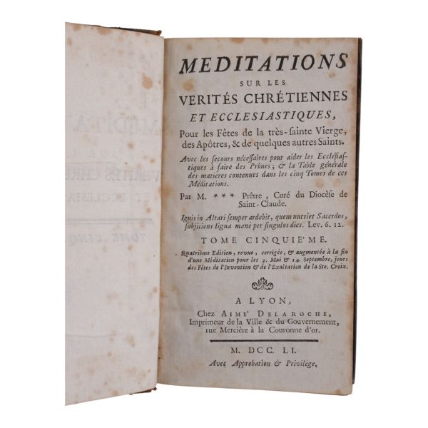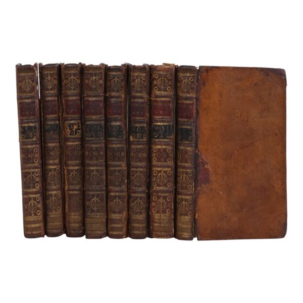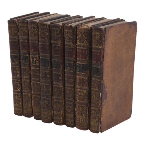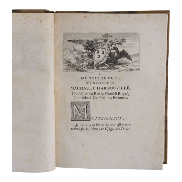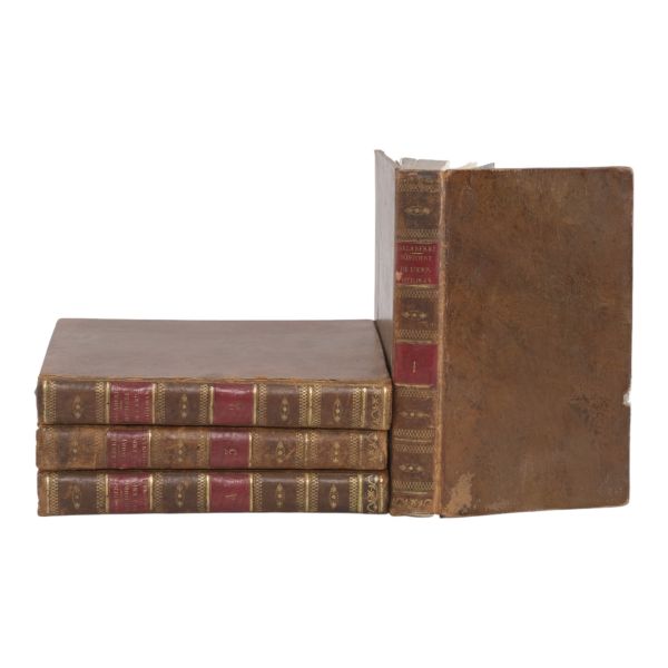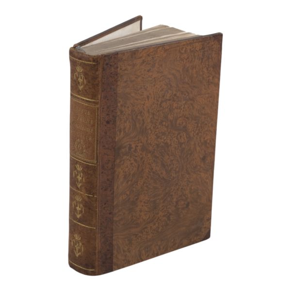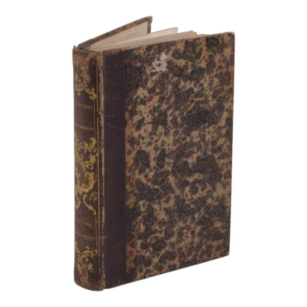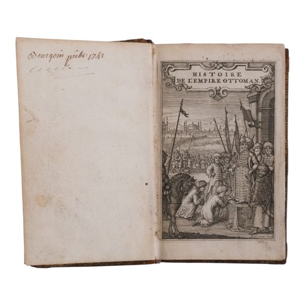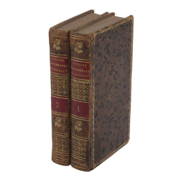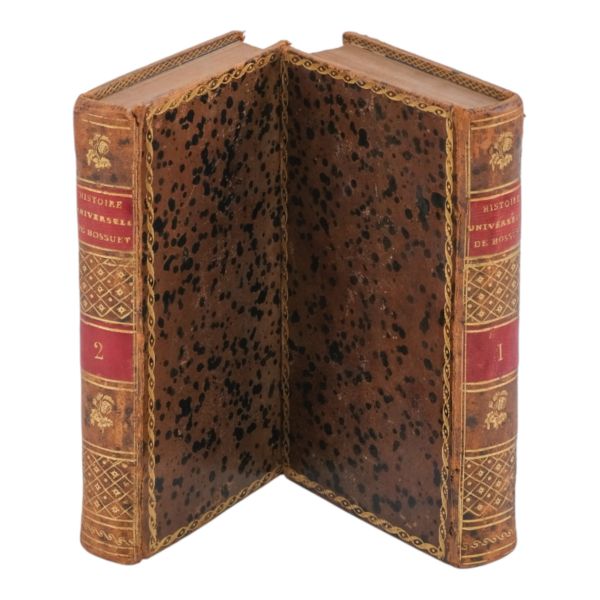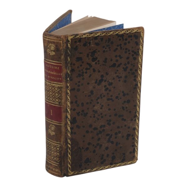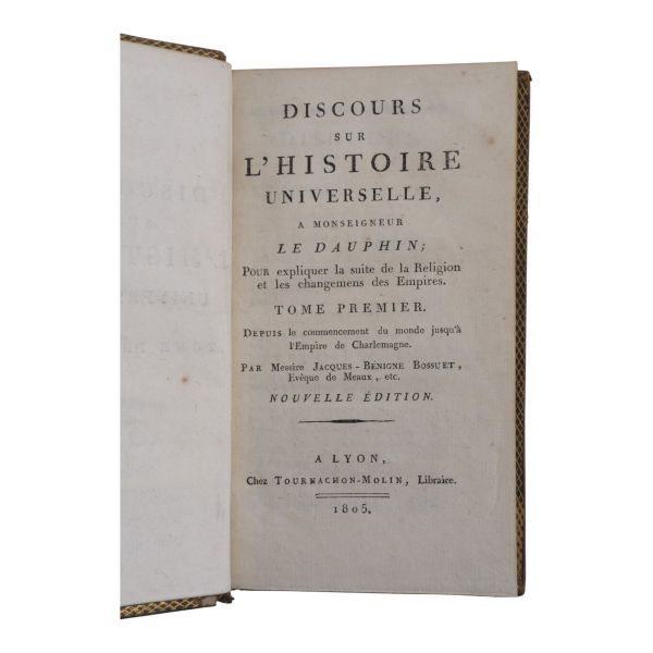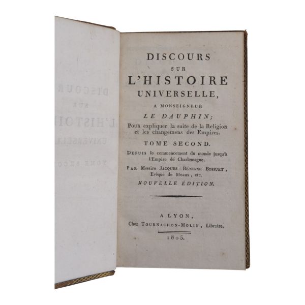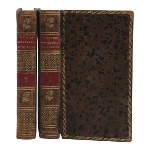 17. yüzyılın en etkili Fransız düşünürlerinden biri olan Bossuet’nin dünya tarihine dair klasik yorumu... Sırtı altın yaldız dekor ve başlıklı, dış ve iç kapakları ebru desenli deri dönem ciltlerinde. Sayfa kenarları altın yaldızlıdır. Ön iç kapaklarında 1815 tarihli şahıs etiketleri yer almaktadır.