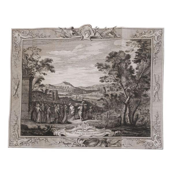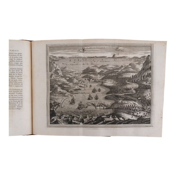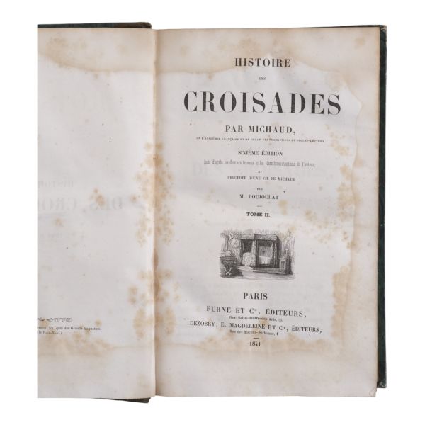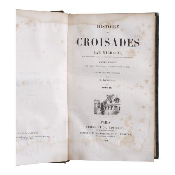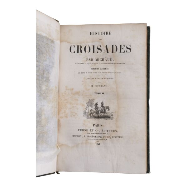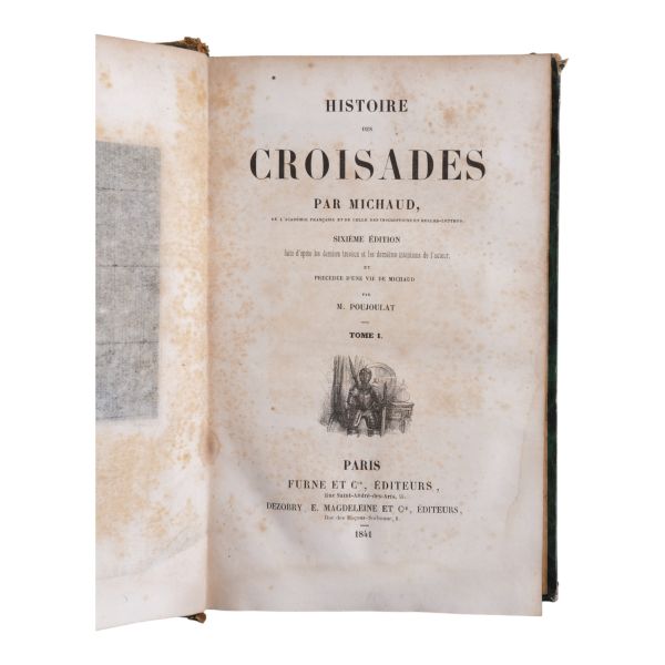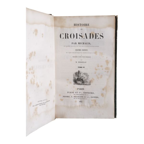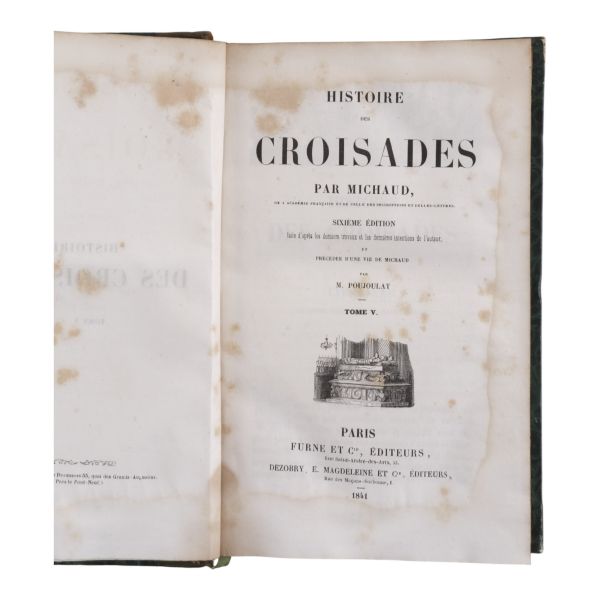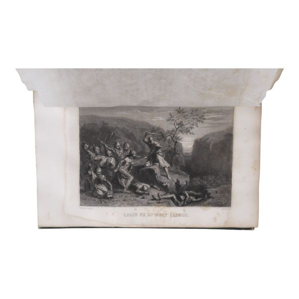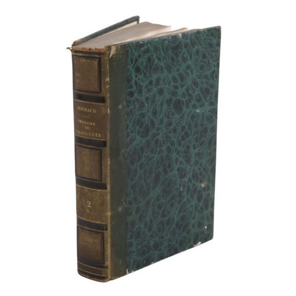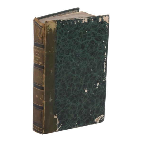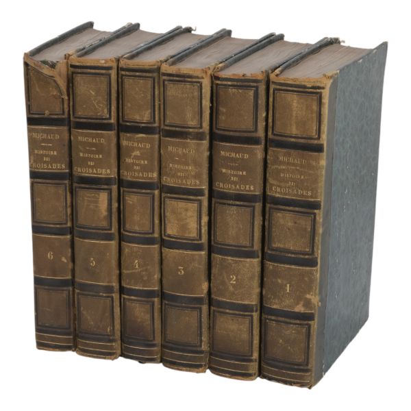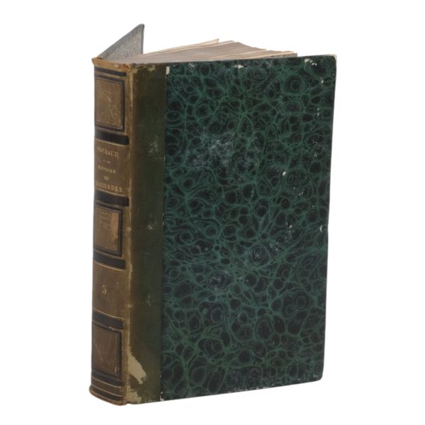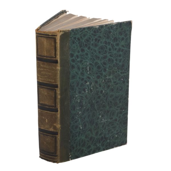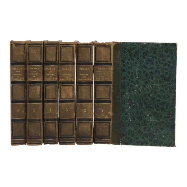 Tam sayfa gravürler ve katlanır haritalar eşliğinde kronolojik Haçlı Seferleri tarihi... Deri sırtları panelli ve altın yaldız başlıklı, iç ve dış kapakları ebru desenli dönem ciltlerinde.
