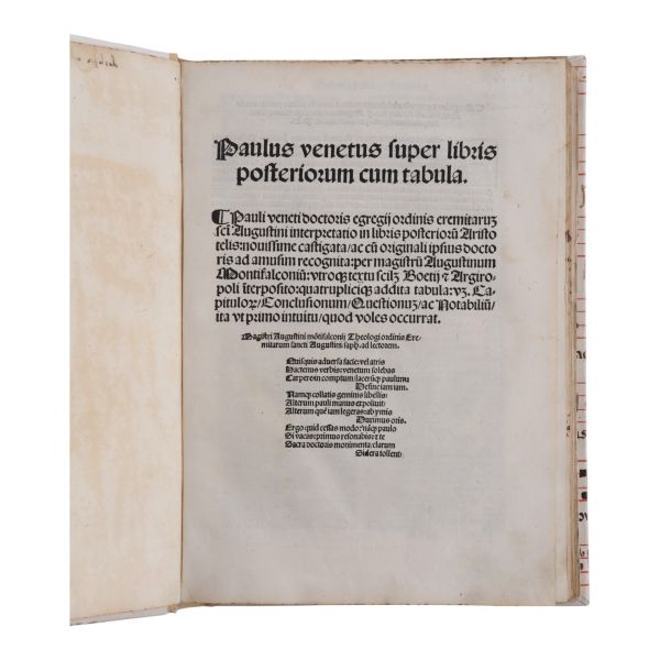 Skolastik filozofu Paulus Venetus’un, Aristoteles’in İkinci Çözümlemeler adlı mantık eserine yazdığı şerhi ihtiva eden erken dönem matbu felsefe metni... Sırtı deri yeni cildinde.