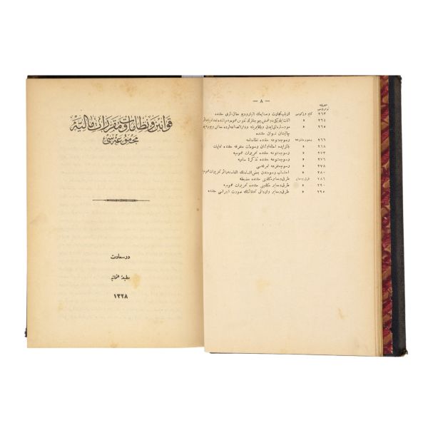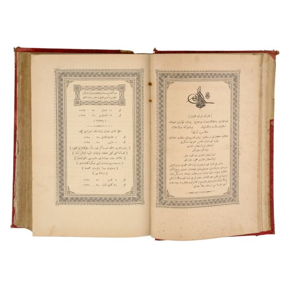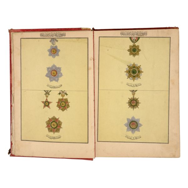 Kırmızı mükâfat cildinde. Osmanlı döneminde toplam 17 adet çıkan askerî salnâme ordunun teşkilatı ve kadroları, subayların adları ve nişanları gibi bilgileri içerir. *237-38. sayfanın olduğu yaprak üst yarıdan yırtılmıştır.