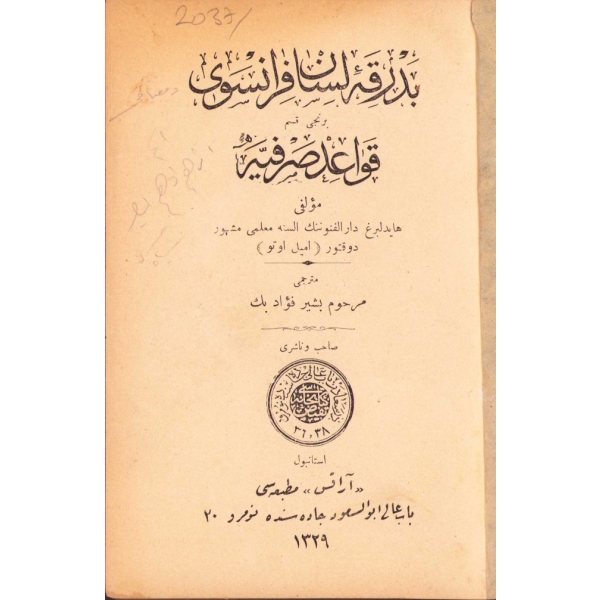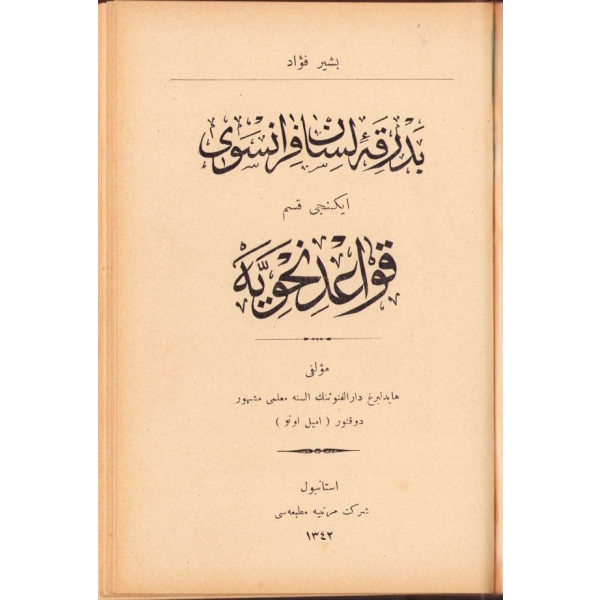 Fransızca Miftâh-ı Bedraka-i Lisân-ı Fransevî, Beşir Fuad, İstanbul 1927, 68 s., ÖZEGE No: 1767, Fransızca dilbilgisi kitabı. 14x19 cm, sırtı ayrık haliyle