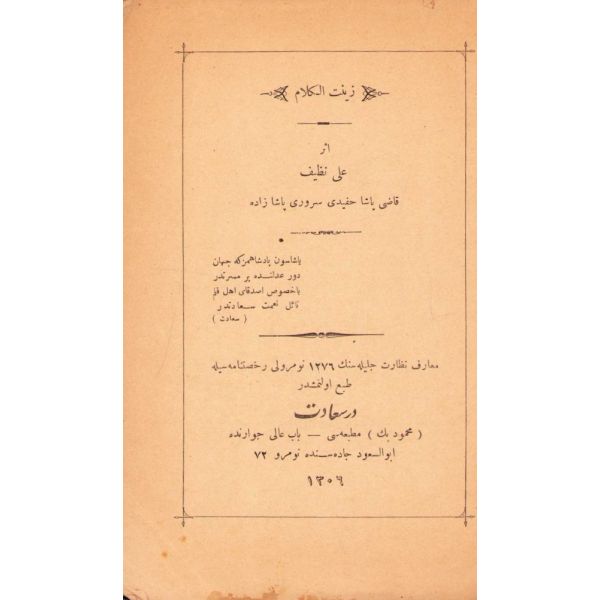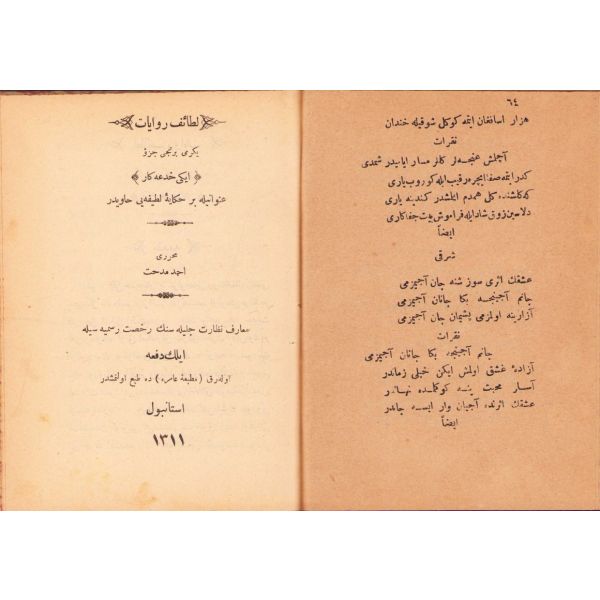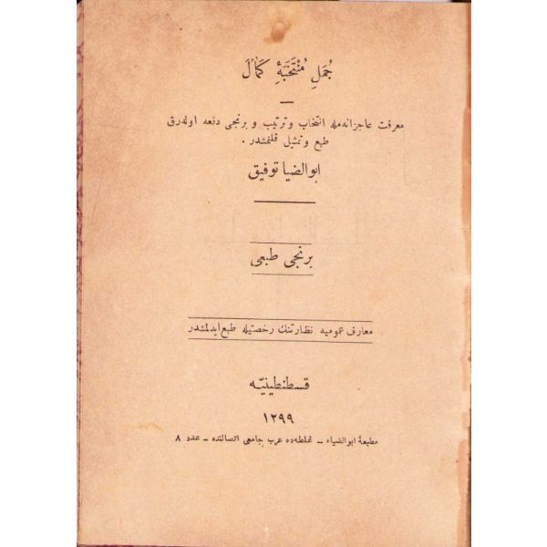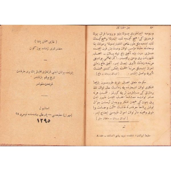 Gazi Osman Paşa Hazretleri Nezdinde Yüz Gün [Plevne'deki yabancı gazetelerden aktarılmıştır], Mihran Matbaası, İstanbul 1295, 56 s.; Yeni Şarkı Mecmûası, Mehmed Nazmi, Cemal Efendi Matbaası, 64 s.; Letâif-i Rivâyât-İki Hud'akâr [Hileci], Ahmed Midhat, Amire Matbaası, İstanbul 1311, 93 s., 12x16 cm