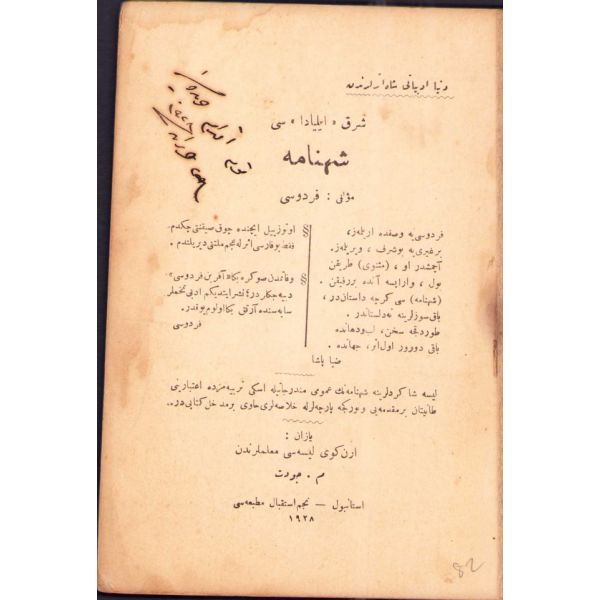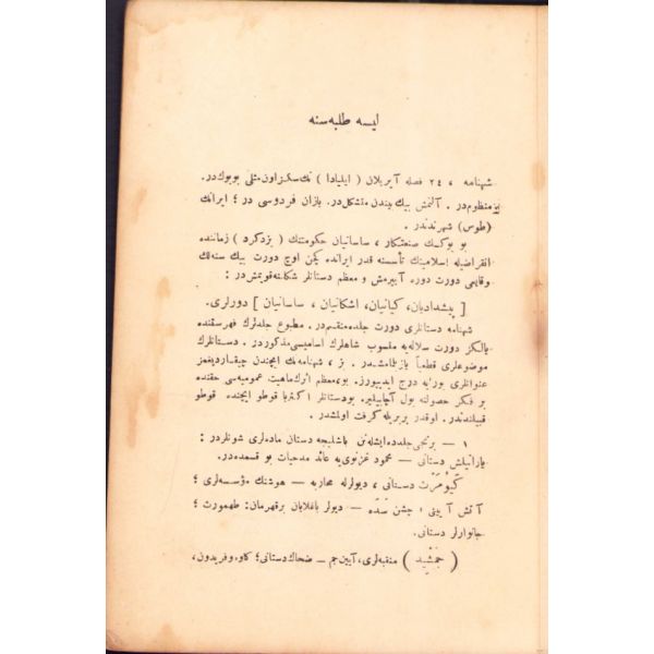 "Lise öğrencilerine Şehnâme'nin genel içeriğiyle eski eğitimimizdeki değerini tanıtan bir mukaddimeyi ve Türkçe parçalarla özetleri içeren bir giriş kitabıdır."