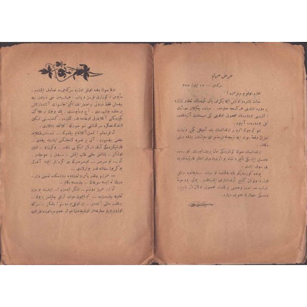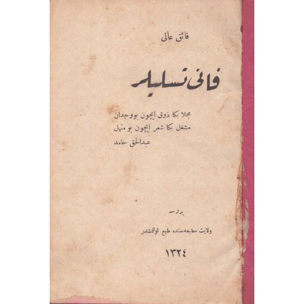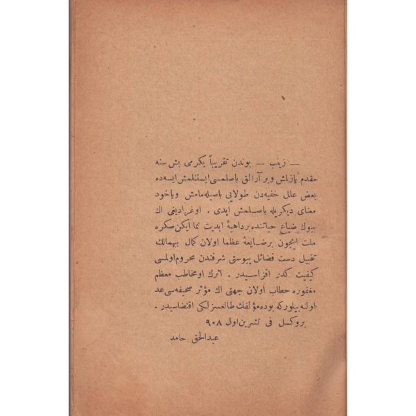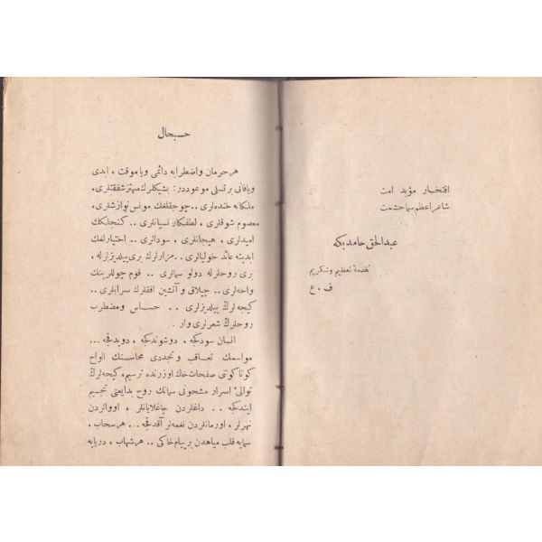 Kitabın arka kapağında yazılı ithaf, "Ehibbaya hediye-i âsâr ve eviddâya daima yadigâr olarak saadetlü mübarek-bâd Cafer Beyefendi hazretlerine hediyedir." şeklindedir.