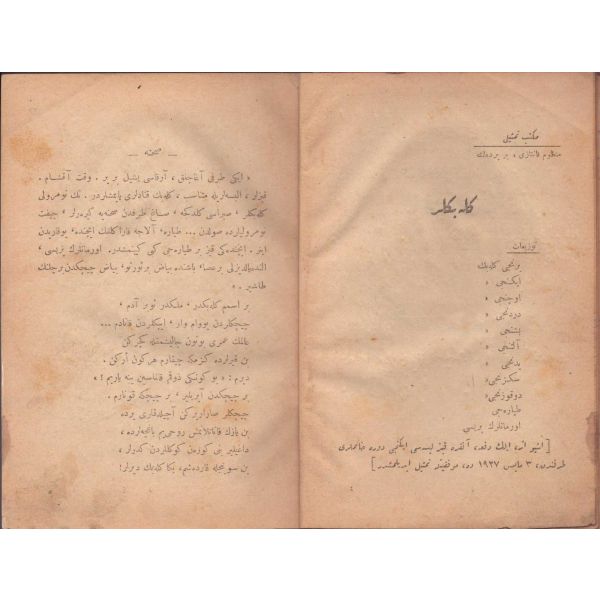 Halide Nusret, Süleyman Nazif, Midhat Cemal, Aka Gündüz, Ahmed Rasim, Ahmed Hikmet, Faruk Nafiz, Halid Fahri, Haşim Nahid, Server Ziya, Hüseyin Suad, Memduh Necdet, Mehmed Nureddin, Tevfik Fikret vd.´ne ait hikâye ve şiirler içermektedir. *Cilt sırtı kopuktur.