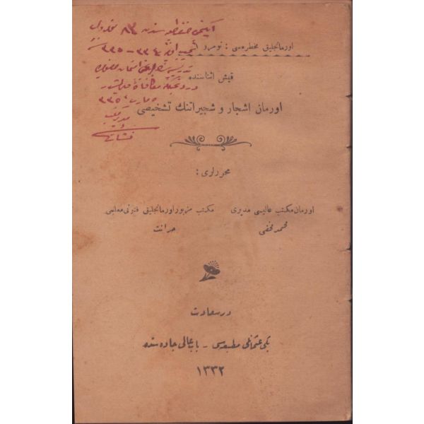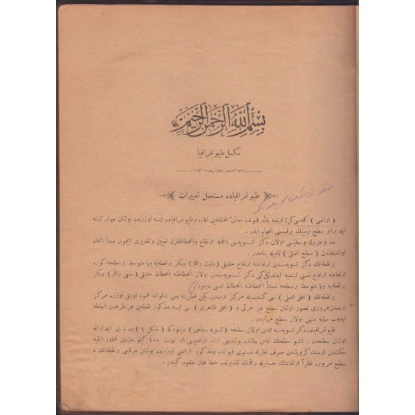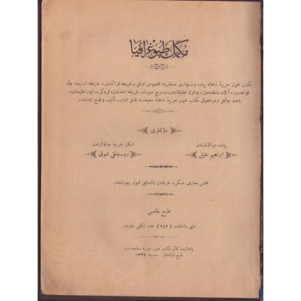 "Mekteb-i Fünun-ı Harbiye-i Şahane piyade ve süvari sınıflarına mahsus olmak ve harita kıraatinden, hartia tersimine aid kavaidden, âlât-ı muntazamadan, ve bunların tatbikatından, ve seri suretde harita ahzından, kroki ve rapor tanziminden bâhis olmak üzere talif ve tab´ olunmuşdur."