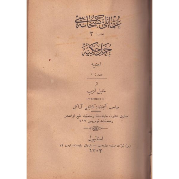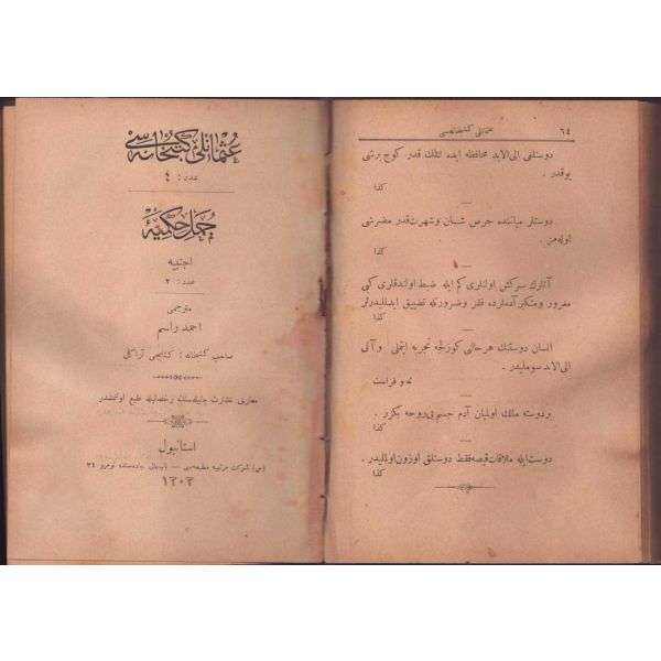 CÜMEL-İ HİKEMİYYE-İ ECNEBİYYE (1), Halil Edib, CÜMEL-İ HİKEMİYYE-İ ECNEBİYYE (2), çev. Ahmed Rasim, S. Şirket-i Mürettibiye Matbaası, İstanbul 1303, 128 s.; GARÂİB-İ ÂDÂT-I AKVÂM, Said, S. Şirket-i Mürettibiye Matbaası, İstanbul 1303, 64 s.; CÜMEL-İ HİKEMİYYE-İ OSMÂNİYYE, derl. Ahmed Rasim, S. Şirket-i Mürettibiye Matbaası, İstanbul 1303, 64 s.; ANİBAL, Mehmed Tevfik, A. M. Şirket-i Mürettibiye Matbaası, İstanbul 1303, 62 s.; ŞERH-İ AHİDNÂME-İ ALİ (Arapça-Türkçe), A. M. Şirket-i Mürettibiye Matbaası, İstanbul 1304, 58 s.; VOLTAİRE, Beşir Fuad, A. M. Şirket-i Mürettibiye Matbaası, İstanbul 1304, 139 s., 13x18 cm