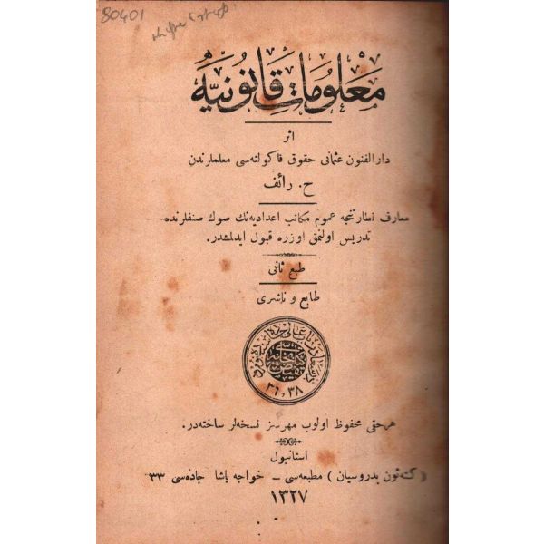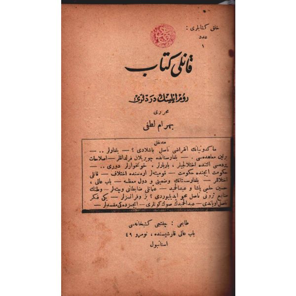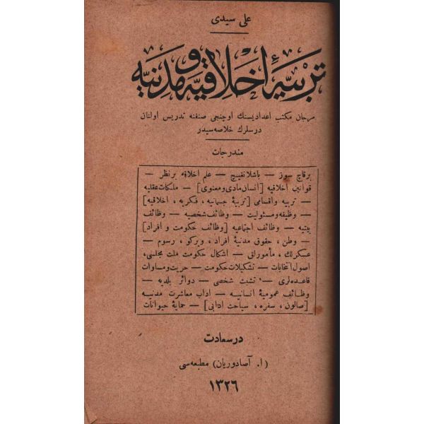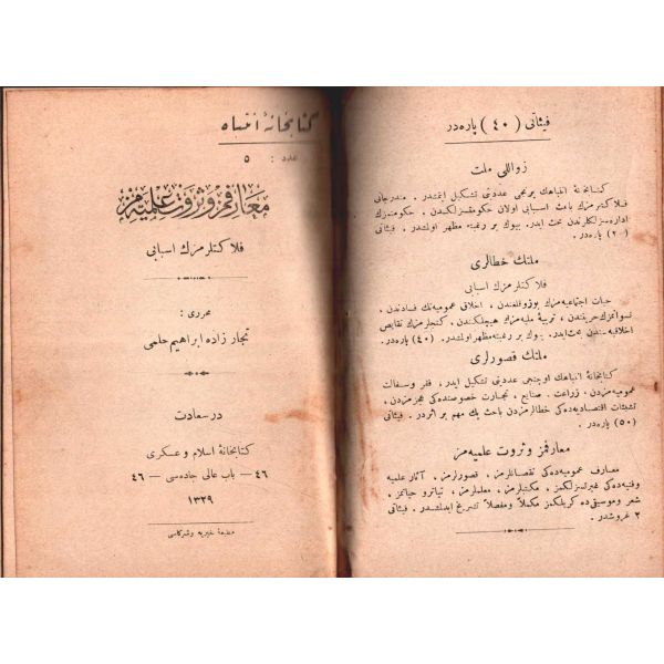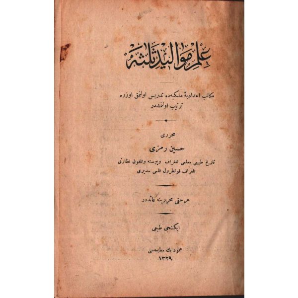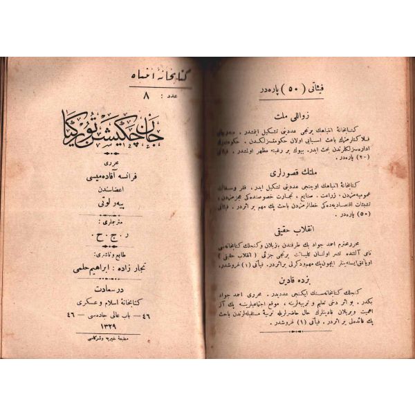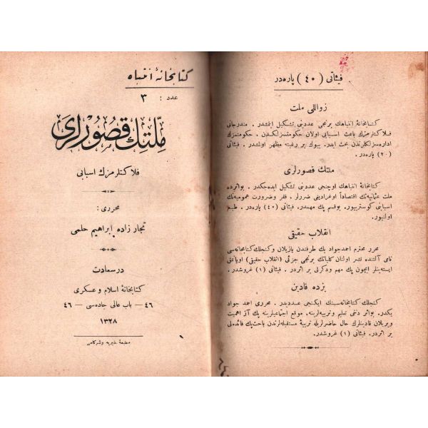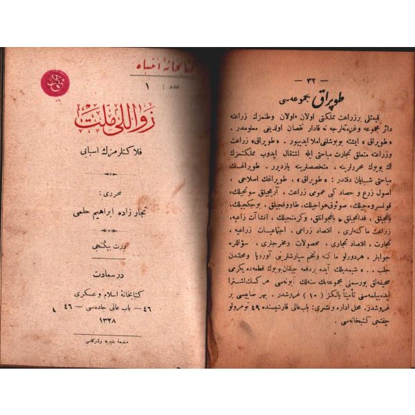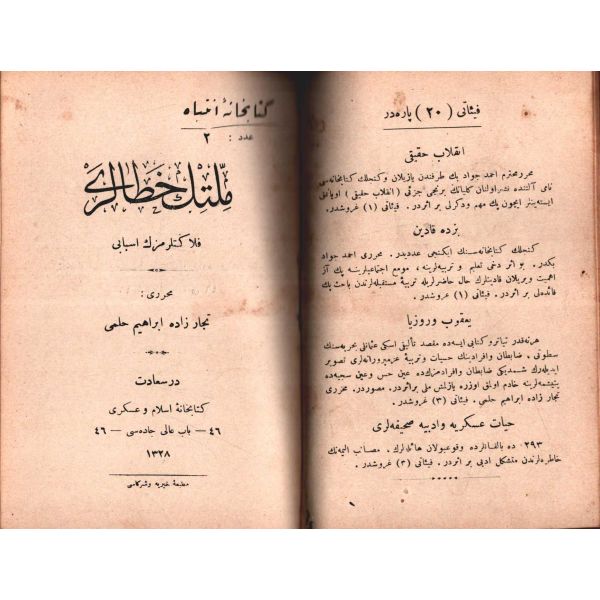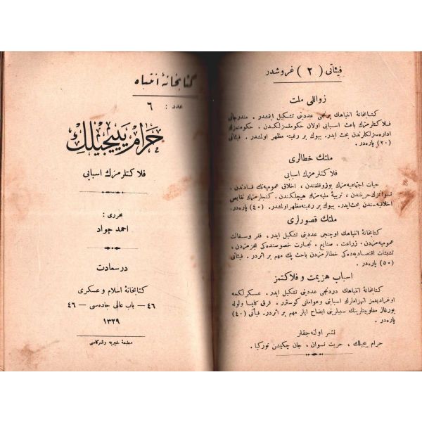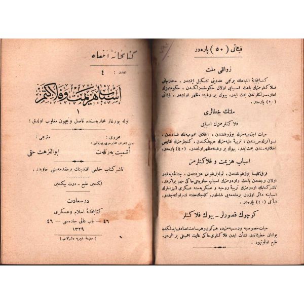 MİLLETİN HATÂLARI (Felâketlerimizin Esbâbı), Tüccarzâde İbrahim Hilmi, Kitabhane-i İslam ve Askerî, İstanbul 1328, 70 s.; MİLLETİN KUSÛRLARI (Felâketlerimizin Esbâbı), Tüccarzâde İbrahim Hilmi, Kitabhane-i İslam ve Askerî, İstanbul 1328, 79 s.; ESBÂB-I HEZÎMET VE FELÂKETİMİZ I, Ashmed Bartlett, çev. Ebunnüzhet Hakkı, Kitabhane-i İslam ve Askerî, İstanbul 1329, 55 s.; MAÂRİF VE SERVET-İ İLMİYYEMİZ (Felâketlerimizin Esbâbı), Tüccarzâde İbrahim Hilmi, Kitabhane-i İslam ve Askerî, İstanbul 1329, 120 s.; HARÂM YİYİCİLİK (Felâketlerimizin Esbâbı), Ahmed Cevad, Kitabhane-i İslam ve Askerî, İstanbul 1329, 70 s.; CAN ÇEKİŞEN TÜRKİYE, Pierre Loti, Kitabhane-i İslam ve Askerî, İstanbul 1329, 114 s., 12x18 cm