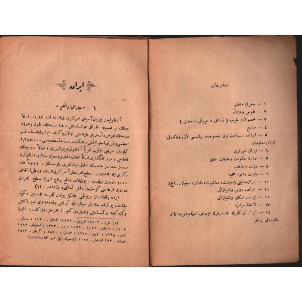 "İklim ve nüfus, servet ve sanat, devlet ve millet, mezheb ve medeniyyet, seyahat şeraiti ve şehirler, Rus-İngiliz faaliyetleri, siyasi ve ictimai hususat"