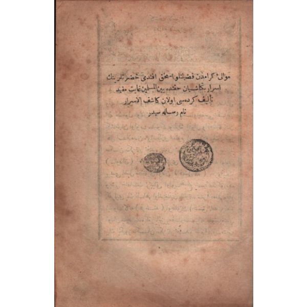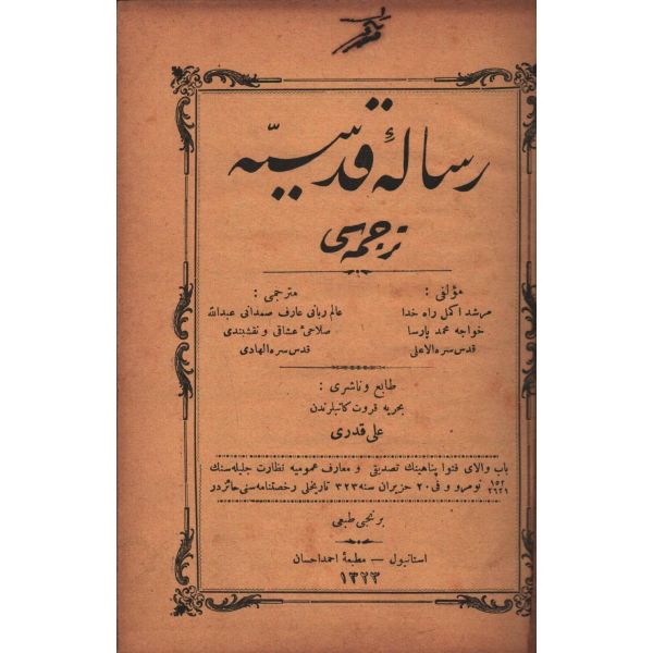 "İşbu MİFTÂHU´L-KULÛB ismiyle müsemma olan kitaba RİSÂLE-İ MURÂKABE ve RİSÂLE-İ PENDİYYE ve RİSÂLE-İ EHL-İ SÜLÛKA LÂZIM OLAN ŞURÛT-I TARÎK-İ ŞEMSEDDÎN NÛRÎ ve RİSÂLE-İ VASİYYETNÂME mecmua olarak bu defa tab´ ve temsil kılındı"