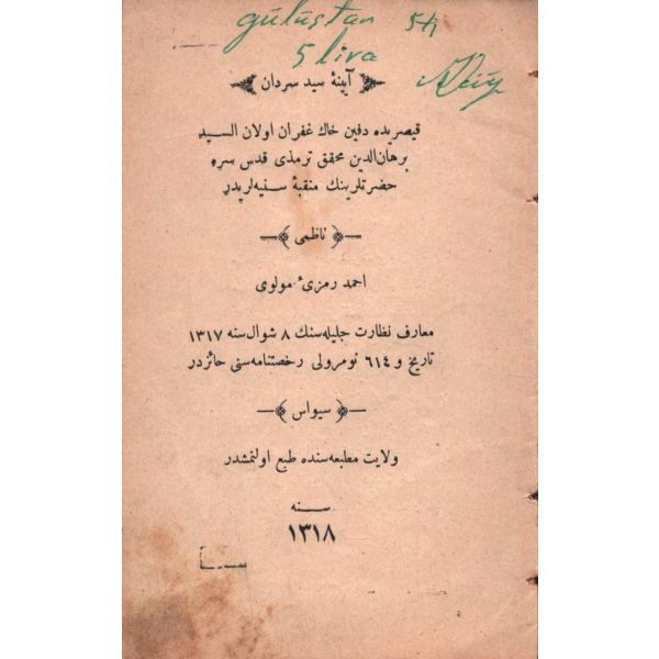 Sırtı ayrıktır. Birkaç sayfasında bir sıvıdan kaynaklı epey büyük bir leke yoktur.