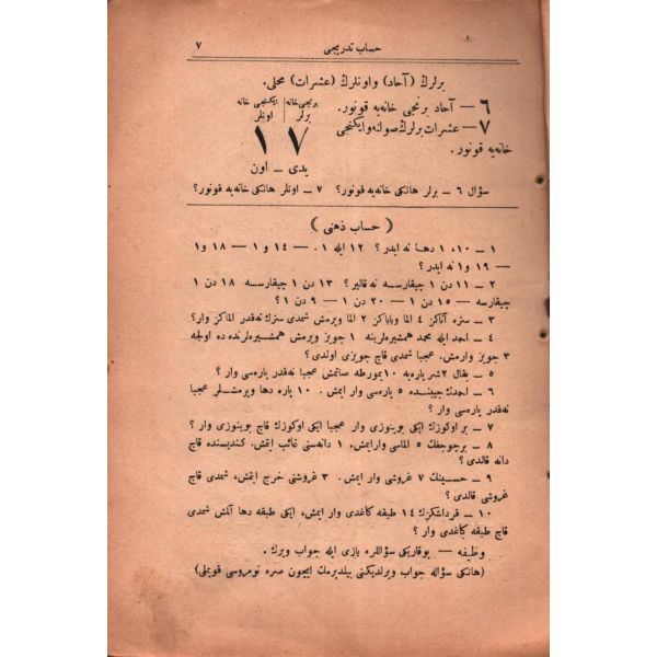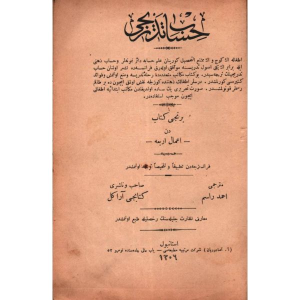 "Etfalin en güç ve en mümteniü´t-tahsil görünen ilm-i hesab numuneleri ve hesab-ı zihnî ile beraber en yeni usul-i tedrise muvafık olarak Fransa´da neşrolunan hesab-ı tedricinin tercümesidir. Bu kitab mektaib-i müteaddidede rahle-i tedrise vaz olunmuş ve fevaid-i kesiresi görülmüşdür. Dersler zihinde güzelce nakşolmak için de bir takım resimler konulmuşdur. Suret-i tahriri pek sade olduğundan mekatib-i ibtidaiyye etfaline elverişlidir."