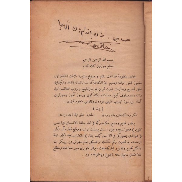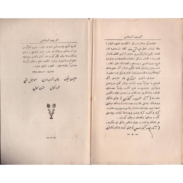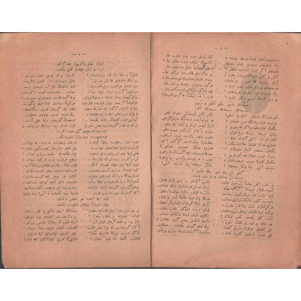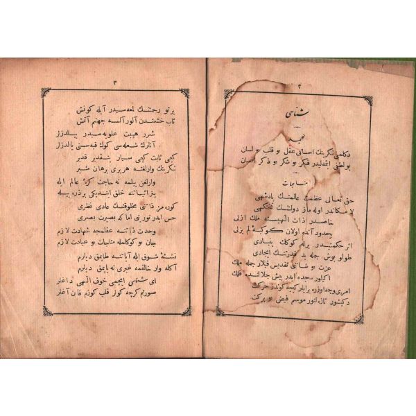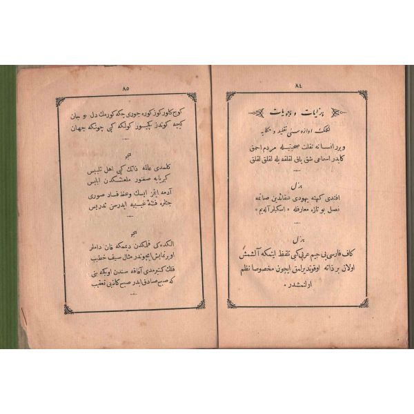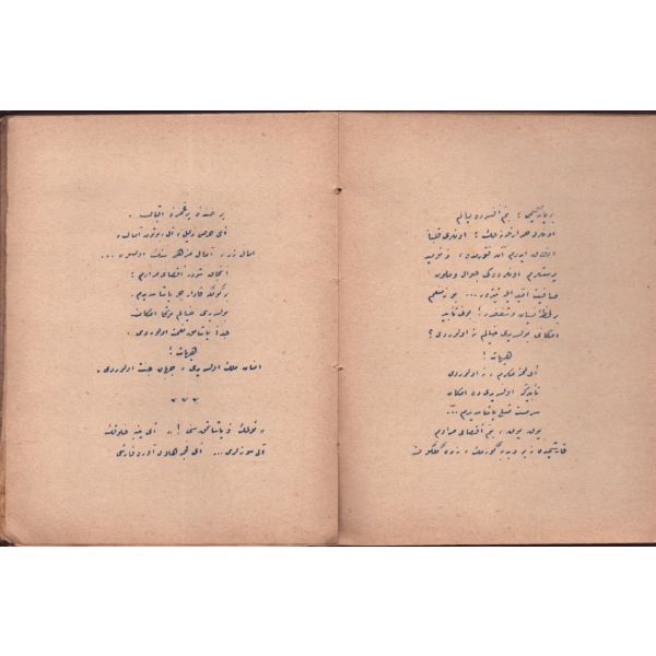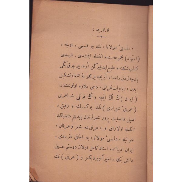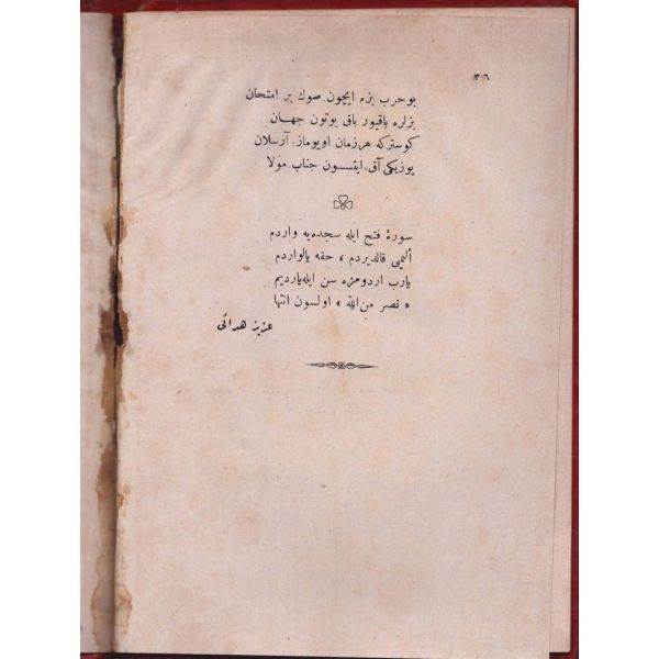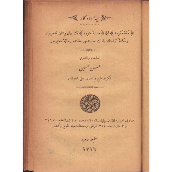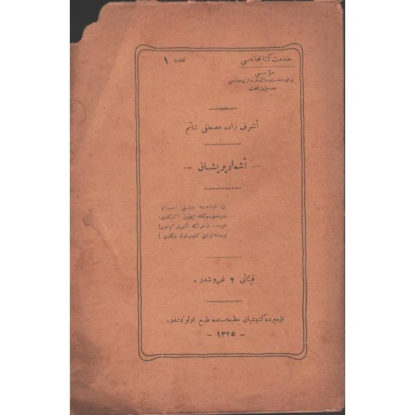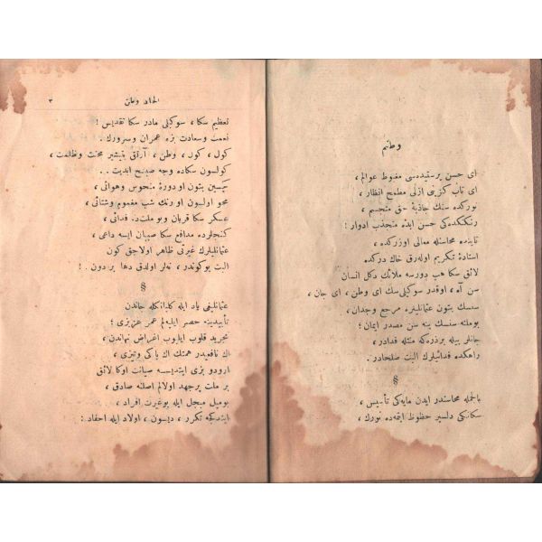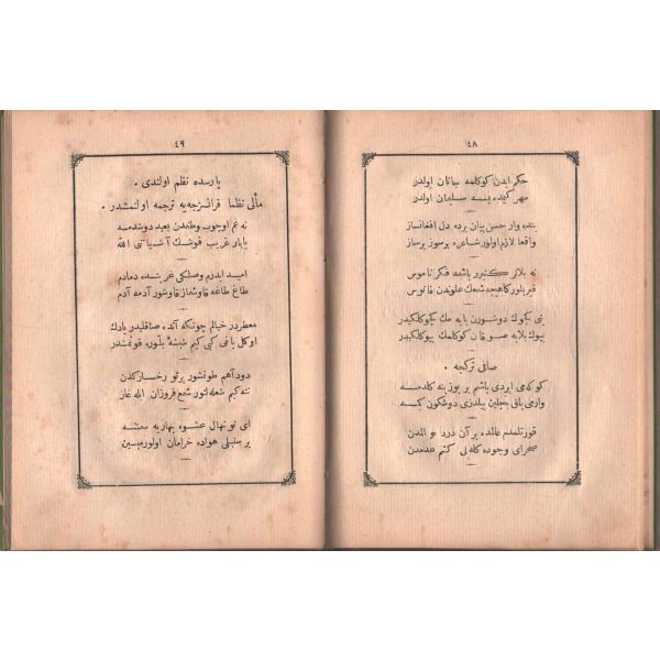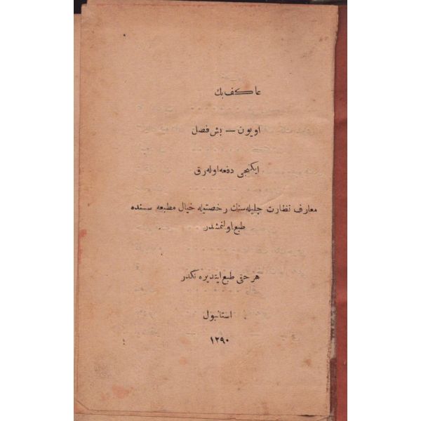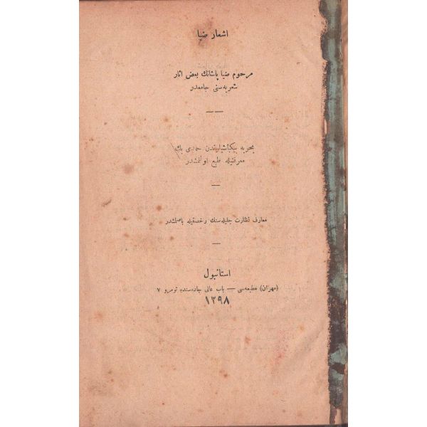 "Müntehabat-ı Eş´ar´ım birinci defa olarak 15 Safer 1279 tarihinde Tasvir-i Efkar gazetehanesinde basılmış idi. İşbu ikinci nüshası ise evvelinden ziyade sahih ve ilaveli olarak yine Tasvir-i Efkar matbaasında tab´ olunmuştur." *Künye sayfası nemden etkilenmiş. Yeni yapılmış, bez cilt içinde...