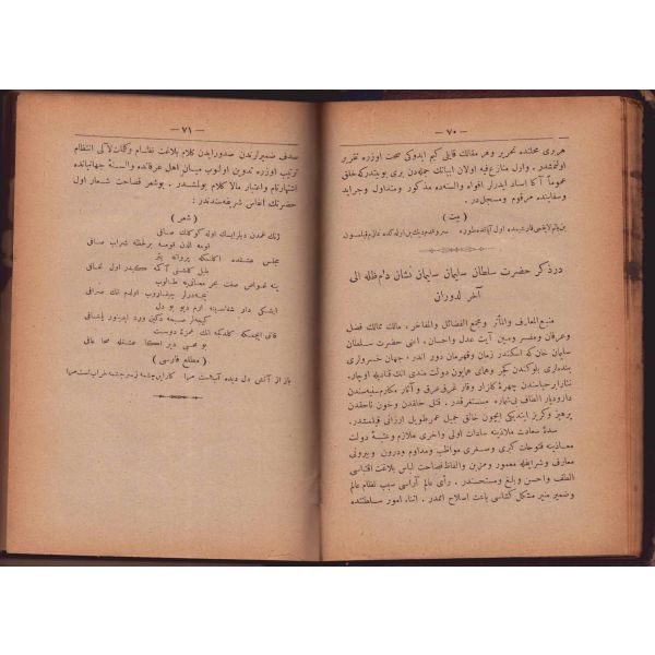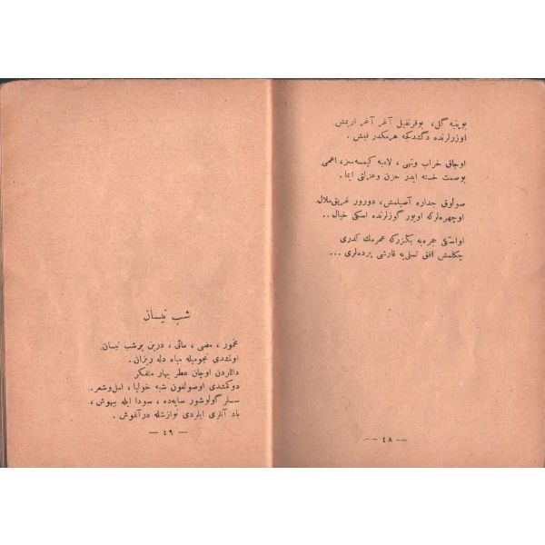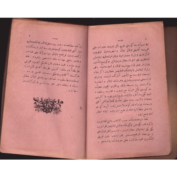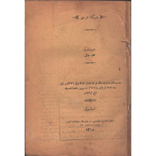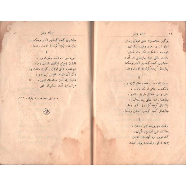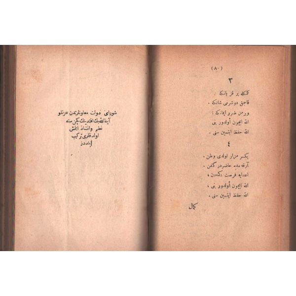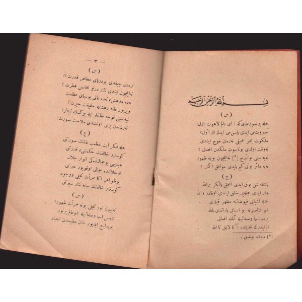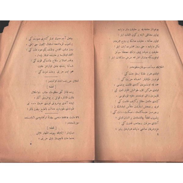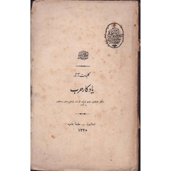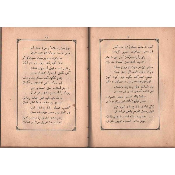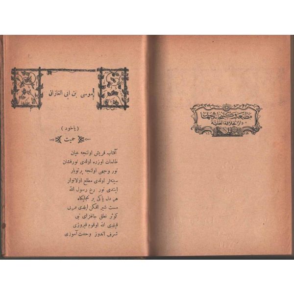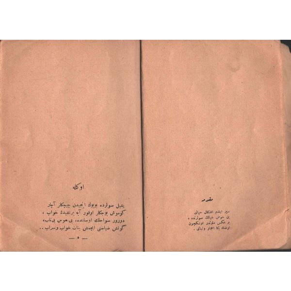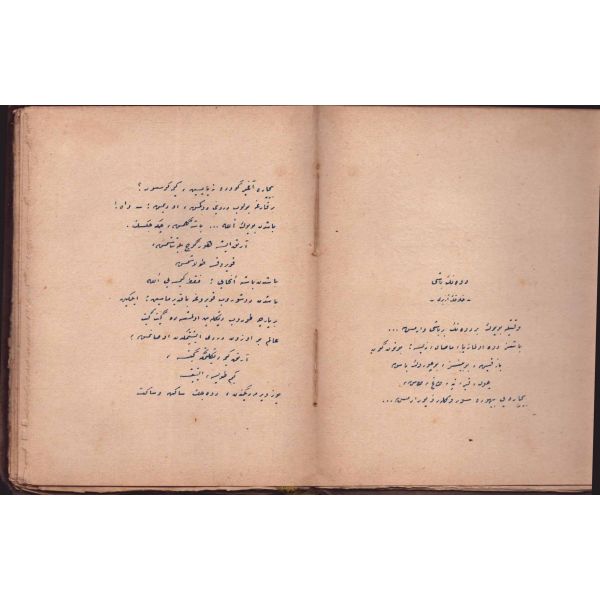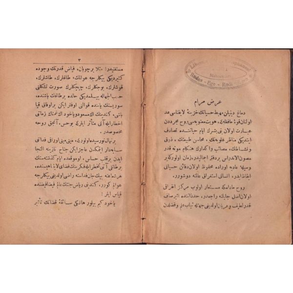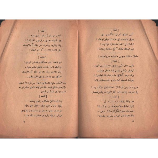 "Müntehabat-ı Eş´ar´ım birinci defa olarak 15 Safer 1279 tarihinde Tasvir-i Efkar gazetehanesinde basılmış idi. İşbu ikinci nüshası ise evvelinden ziyade sahih ve ilaveli olarak yine Tasvir-i Efkar matbaasında tab´ olunmuştur." *Künye sayfası nemden etkilenmiş. Yeni yapılmış, bez cilt içinde...