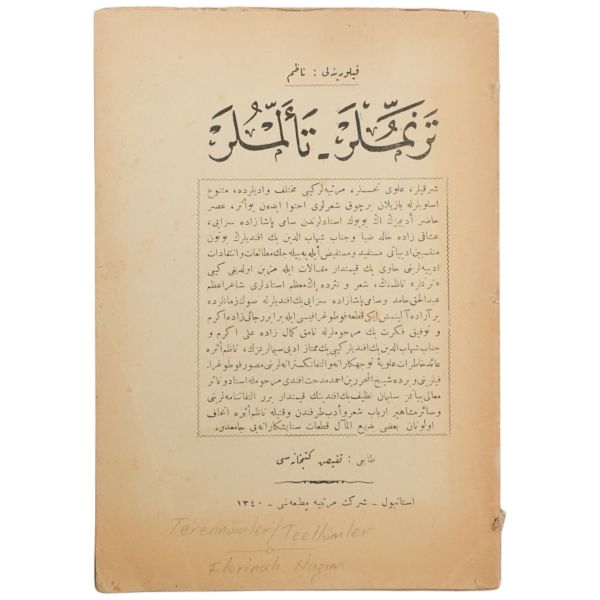 Türk edebiyatı tarihinin, hiç kuşkusuz, en enteresan ve en egosantirik kişilerinden biri olan "Şiir Kralı" Filorinalı Nazım'ın terennümleri ve teellümleri...