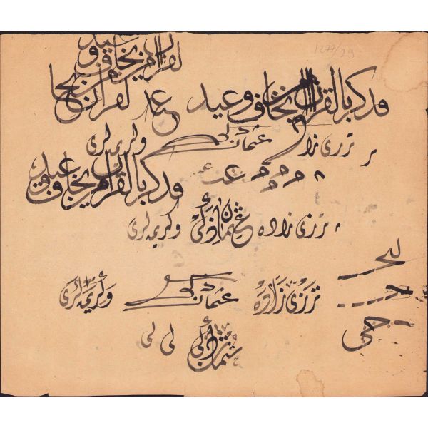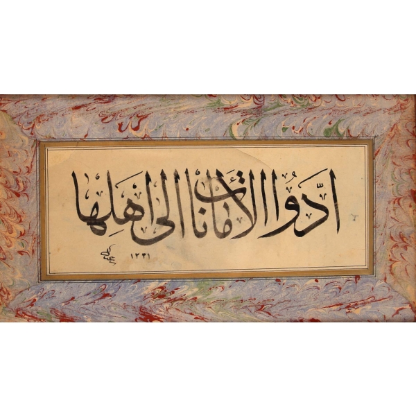 Emin Barın'ın meşhur istifinin ilk eskizlerinden olduğu anlaşılmaktadır. Emin Barın [ö. 1987], son devir hattat ve mücellitlerindendir. 1913'te Bolu'da doğan Emin Barın, hattat müzehhip ve mücellit Hafız Tevfik Efendi'nin oğludur. Güzel Sanatlar Akademisi'nde Türk Süsleme Sanatları Bölümü'nde Reisü'l Hattatin Kamil Akdik'den hat, Necmettin Okyay'dan klasik Türk ciltçiliği dersleri almıştır.