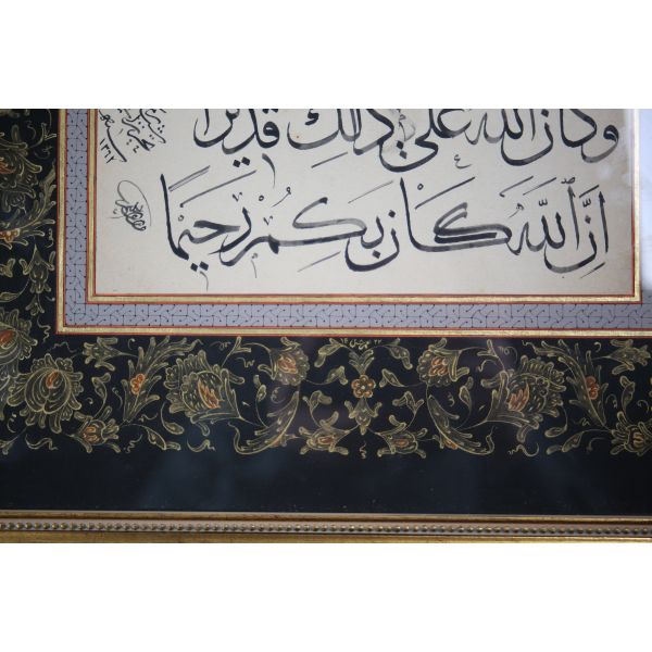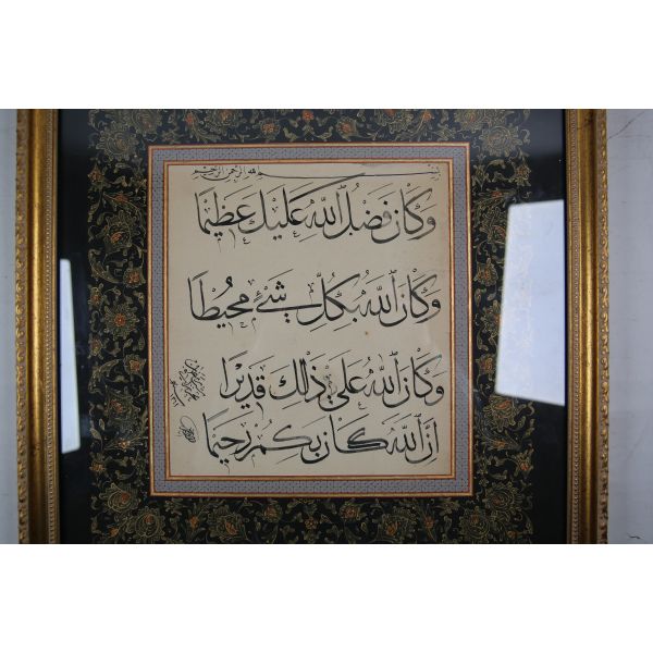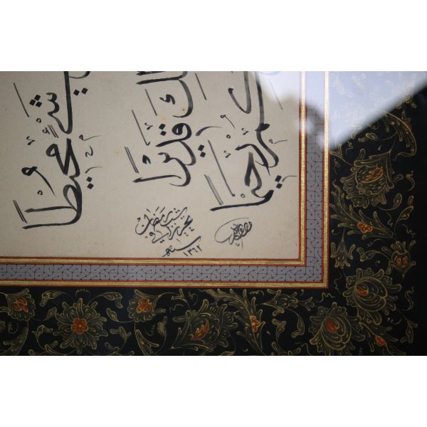 İnce kağıda yazılmıştır.Mustafa Halim Özyazıcı, Nalıncı Hacı Cemâl Efendi’nin oğlu olarak H. 20 Şa'bân 1315/m. 14 Ocak 1898’de İstanbul’da doğdu. Asıl ismi Mustafa Abdülhalim’dir. Esekapısı İbtidâî Mektebi’nde ve daha sonra Haseki’deki Gülşen-i Ma’arif Rüşdî Mektebi’nde okudu. Mektebin yazı hocası olan Hâmid Aytaç’tan sülüs ve nesih, Ferîd Bey’den de dîvânî ve rık’a dersleri aldı. Mezun olduktan sonra Sanayi-i Nefîse Mektebi’nin hâk ve resim şubesine girdi. Ertesi sene, yeni açımış ollan Medresetü’l-hattatin’e kaydoldu. Burada Hasan Rıza Efendi ve Kamil Akdik’ten yeniden sülüs ve nesih, Tuğrakeş İsma’il Hakkı Altunbezer’den celi sülüs ve Hulusi Yazgan’dan da ta’lik meşketti. Medresetü’l-hattatin’den 1918’de şahadetname aldıktan sonra Divan-ı Hümayun Kalemi’ne girdi.
