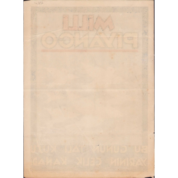 arkasında Osmanlıca " Millet muhabbetinden kuvvet alır donanma, Bir Lahza intikamı, düşmanları unutma, İster misin bu bayrak Balkanlara dikilsin, Sev Türklüğü gönülden gelsin o şanlı ferda" yazılı,