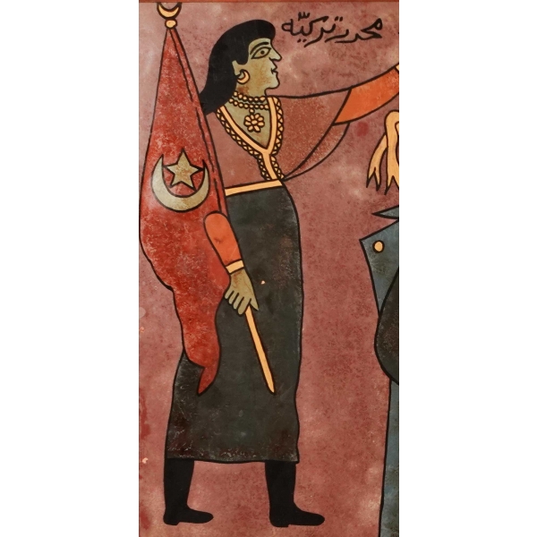 Yanı başında asalet ve hakimiyetin sembolü olan iki aslan ve bir yanında İslamiyeti simgeleyen yeşil sancak taşıyan; diğer yanında Türklüğü simgeleyen al sancak taşıyan iki kadının, başı üzerine çiçeklerden oluşturulan bir tac kondurduğu esnada mareşal üniformasıyla gururlu bir duruş sergileyen Mustafa Kemal Atatürk resmedilmiştir.