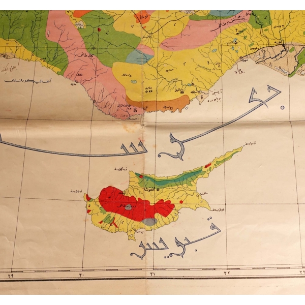 Harita üzerinde, çeşitli renklendirmelerle toprak türleri işaretlenmiştir ve cetvelde bu renklendirmeler detaylı şekilde anlatılmıştır. Bunun yanı sıra yer altı zenginlikleri de çeşitli işaretlerle gösterilmiştir.