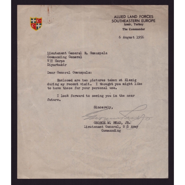 Sonraki yıllarda Türk Silahlı Kuvvetlerinin 11. Genelkurmay Başkanı olarak görev yapacak olan Türk asker ve siyasetçi Mehmet Ragıp Gümüşpala´ya hitaben kaleme alınan mektup, şu ifadeleri içermektedir: "Sayın General Gümüşpala: Ekte son ziyaretim sırasında Elazığ´da çekilmiş iki fotoğraf bulunmaktadır. Bunları kişisel kullanımınız için almak isteyebileceğinizi düşündüm. Sizi yakın gelecekte görmeyi sabırsızlıkla bekliyorum."