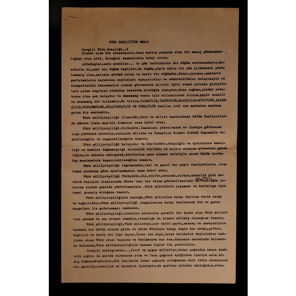 Lot içerisinde yer alan "Türk Gençliğine Mesaj" başlıklı metin sureti ise, Türkeş'in ilk paragrafta belirttiği gibi bir gencin kendisine mektup yazarak kendilerine bir mesaj göndermesini rica etmesi sonucu kaleme dökülmüştür. Türk milliyetçiliğine dair detaylı açıklamalara yer verilen metin, "Ey kahraman çocuklar! Size diş gösteren, saldıran, hakaret eden inançsız kara ruhlulara aldırmadan ileriye atılınız... Ülkü ve heyecan dolu temiz ruhlarınızdan güneşler doğacaktır! Yarınlar sizindir... Başarı, mutluluk ve selâm sizlere..." ifadeleriyle noktalanmaktadır.