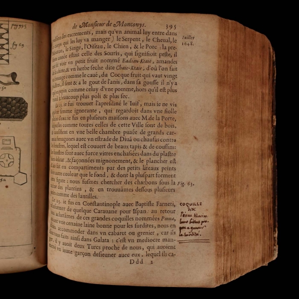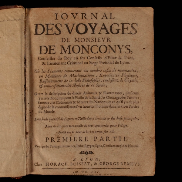 Metafizik ve mistisizme büyük ilgi duyan Fransız fizikçi ve yargıç Balthasar de Monconys´nin, Yunan ve Arap simyacıların öğretilerinin kaynaklarını keşfetmek ve bilim adamlarıyla bilgi alışverişi yapmak amacıyla Küçük Asya ve Kutsal Topraklar´a, Portekiz´e, İspanya´ya, İtalya´ya, İngiltere´ye, Hollanda´ya ve Almanya´ya yaptığı yolculuklarda tuttuğu güncelerin, ölümü sonrası oğlu tarafından derlenip yayımlanmış hali... Sırtı altın yaldız dekorlu, tümüyle deri dönem cildinde. Cildinde bölgesel yıpranmalar ve genel yorgunluk mevcuttur.