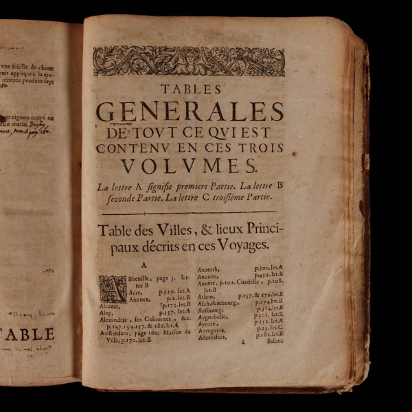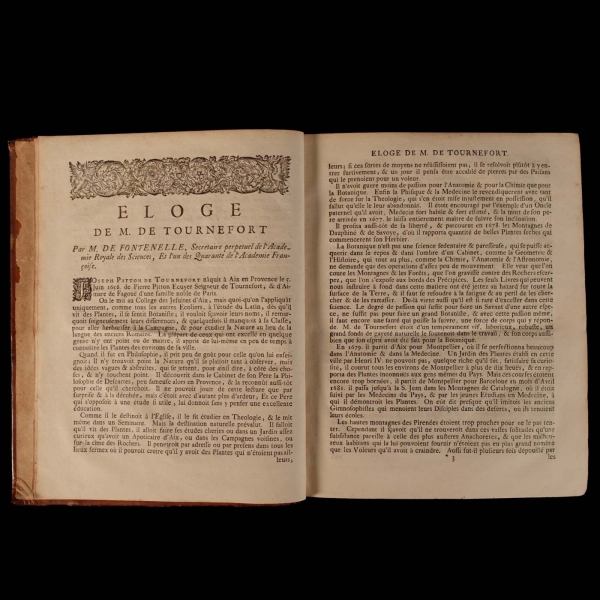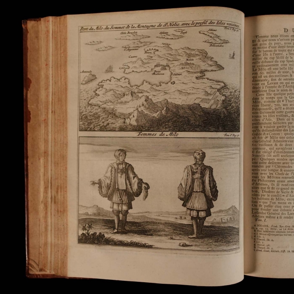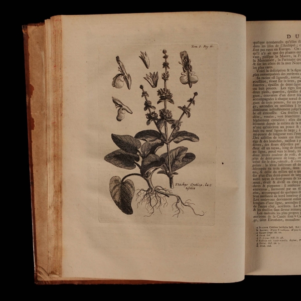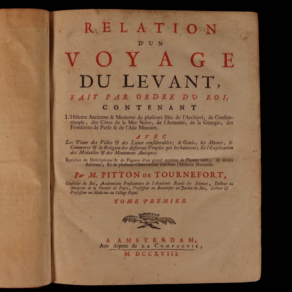 Fransa krallık bahçelerinde botanik profesörü olarak görev yapan Joseph Piton de Tournefort´un, XIV. Louis´in emriyle, yeni bitkiler bulmak üzere çıktığı Doğu yolculuğundaki gözlemlerini kaleme aldığı meşhur seyahatnamesi... 4 adet katlanır levha içeren eserde çok sayıda tam ve yarım sayfa gravür mevcuttur. Sırtı altın yaldız dekorlu, tümüyle deri dönem cildinde.